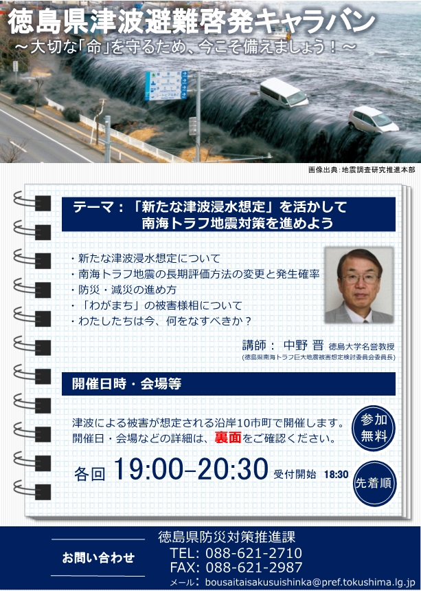 県は、去る9月12日に公表した「徳島県津波浸水想定」を契機に、県民の皆様に「津波避難」に対する理解を深めていただくため、津波による被害が想定される沿岸10市町で、徳島県津波避難啓発キャラバンを開催しています。