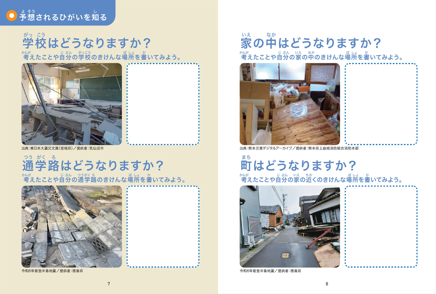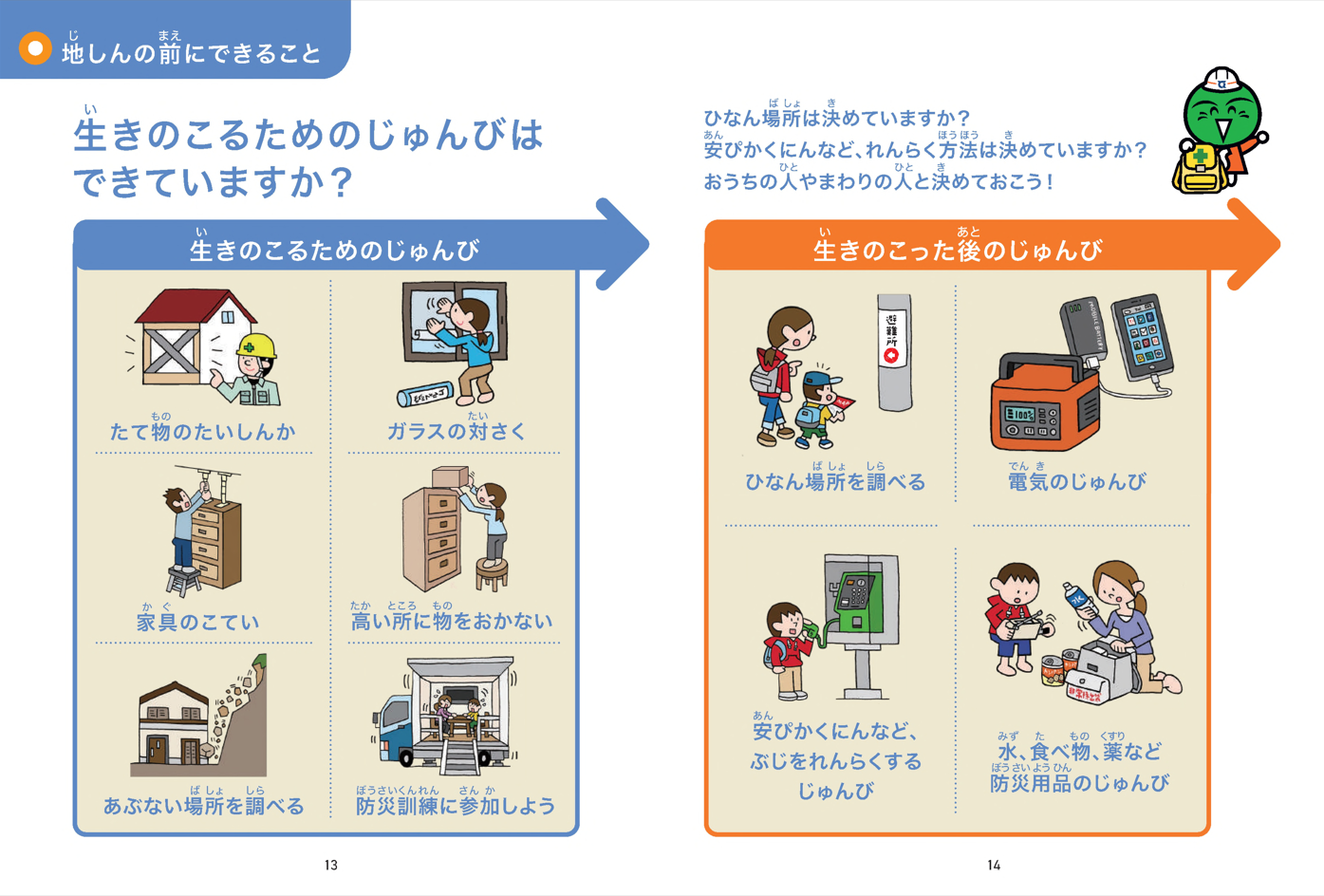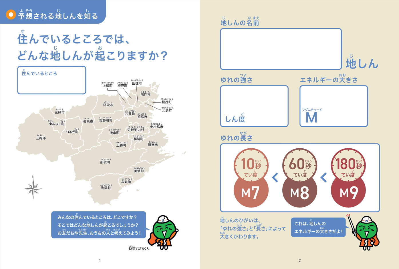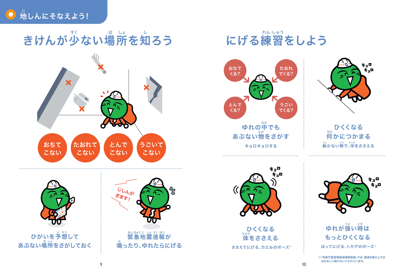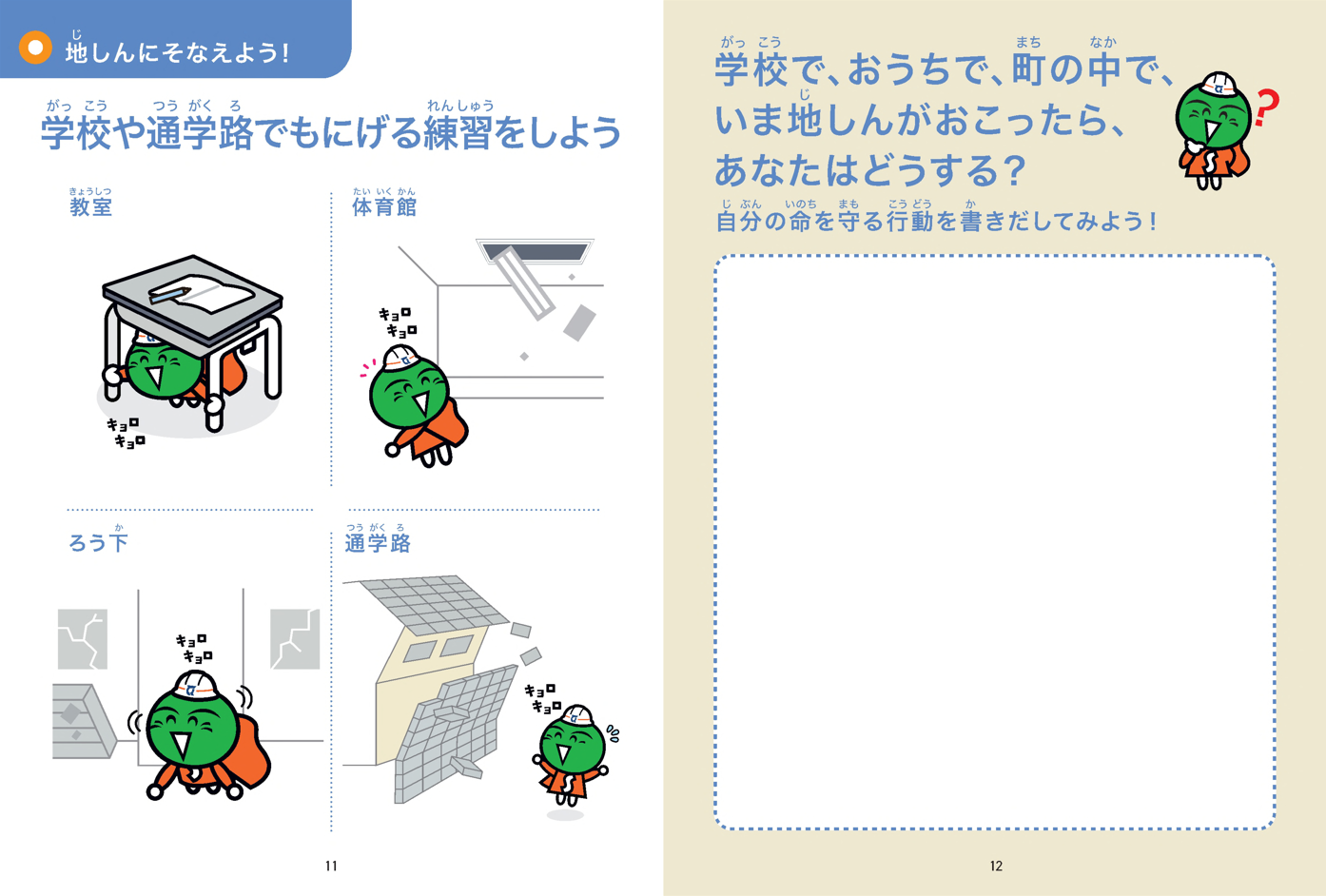 このノートは、地震が起きたときに「自分の命を自分で守る力」を身につけ、家族やまわりの人と「助け合う心」を育てるために作成しました。 防災について楽しく学び、いざという時のために逃げる練習をして、みんなで「地震に負けない安全な町」をつくっていきましょう。