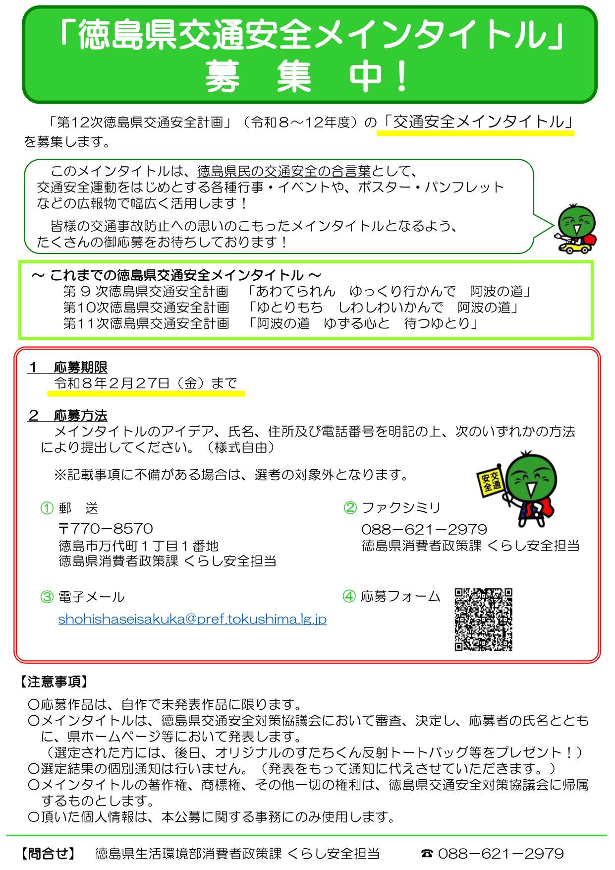 「第12次徳島県交通安全計画」(令和8~12年度)の「交通安全メインタイトル」を募集します。