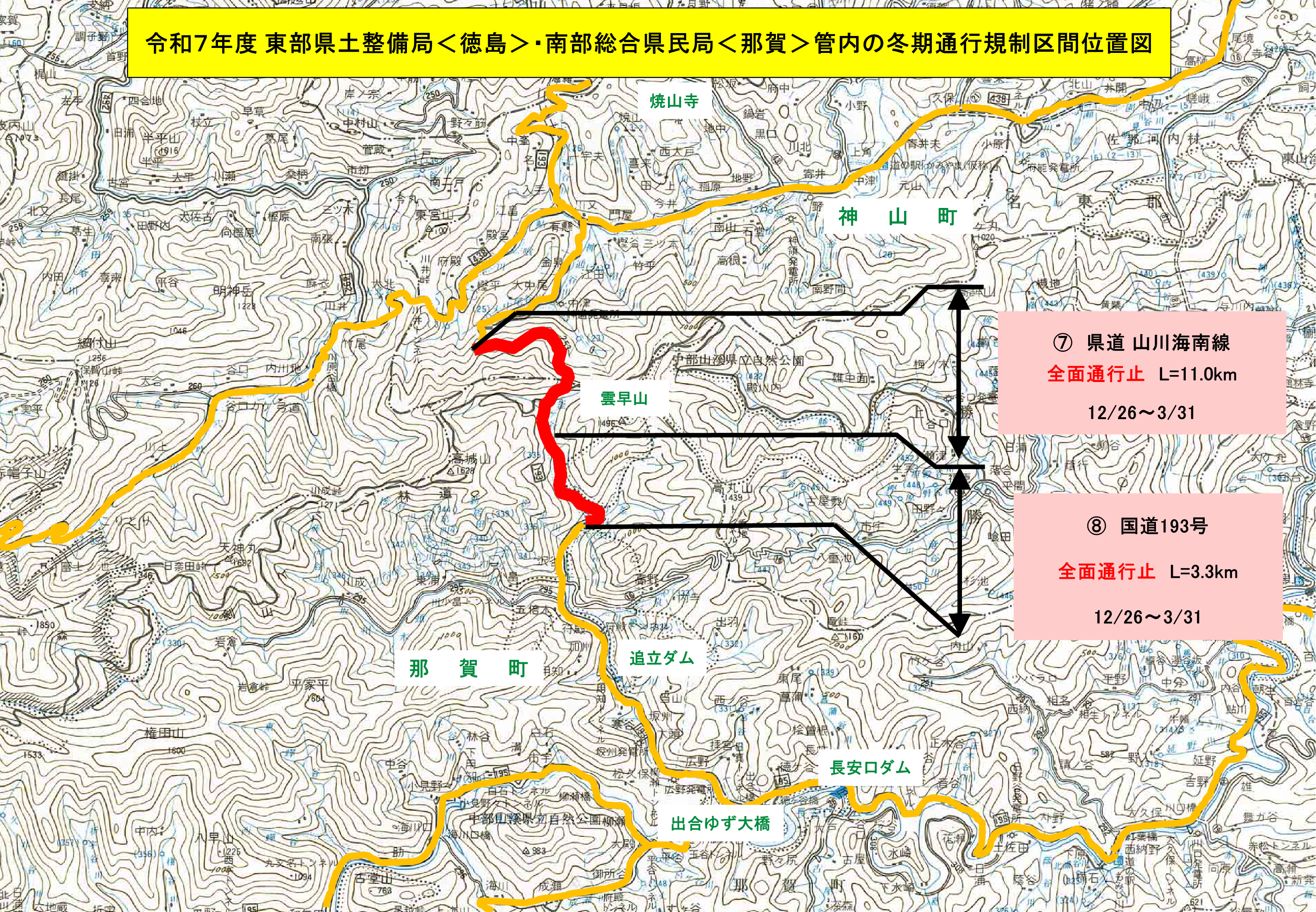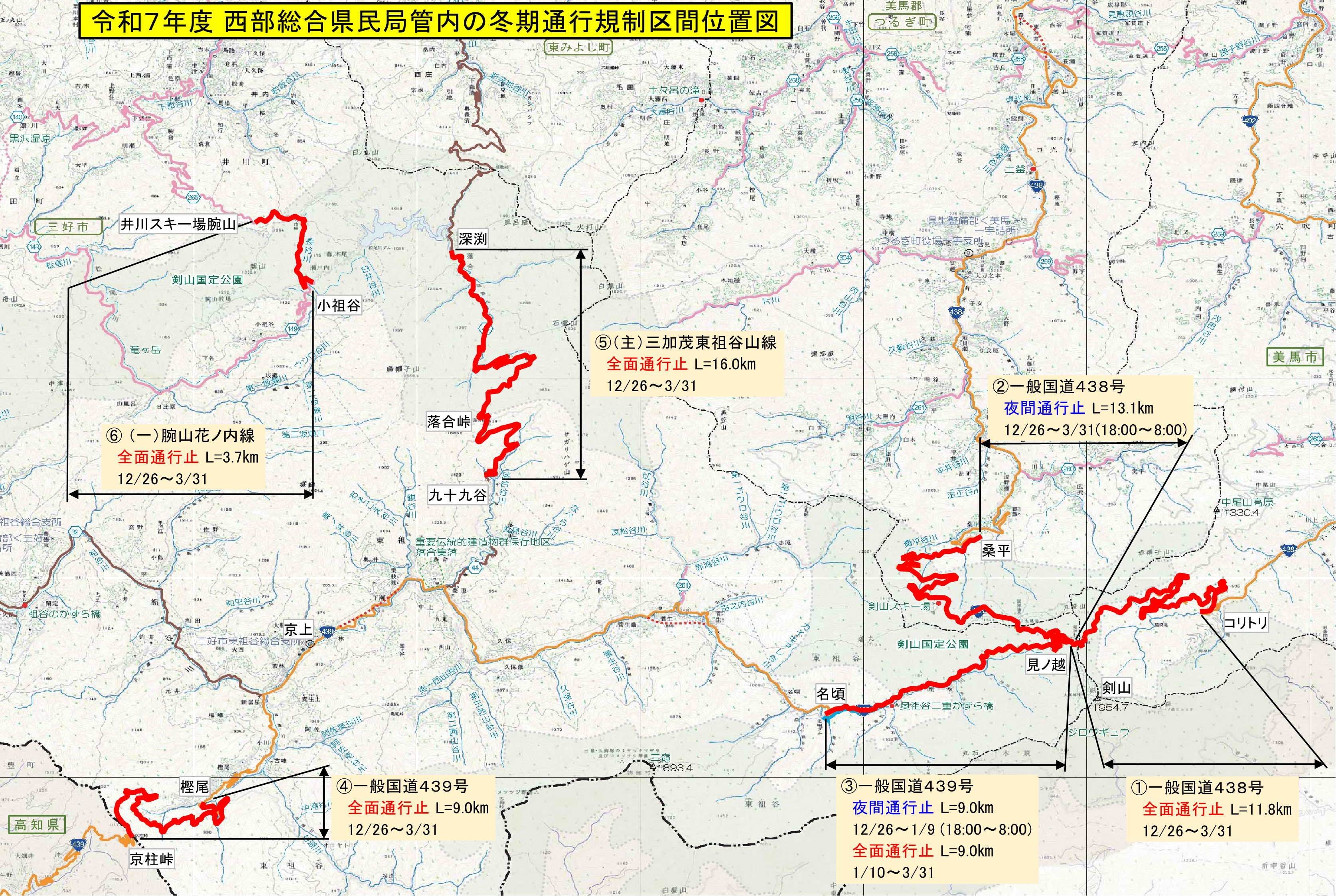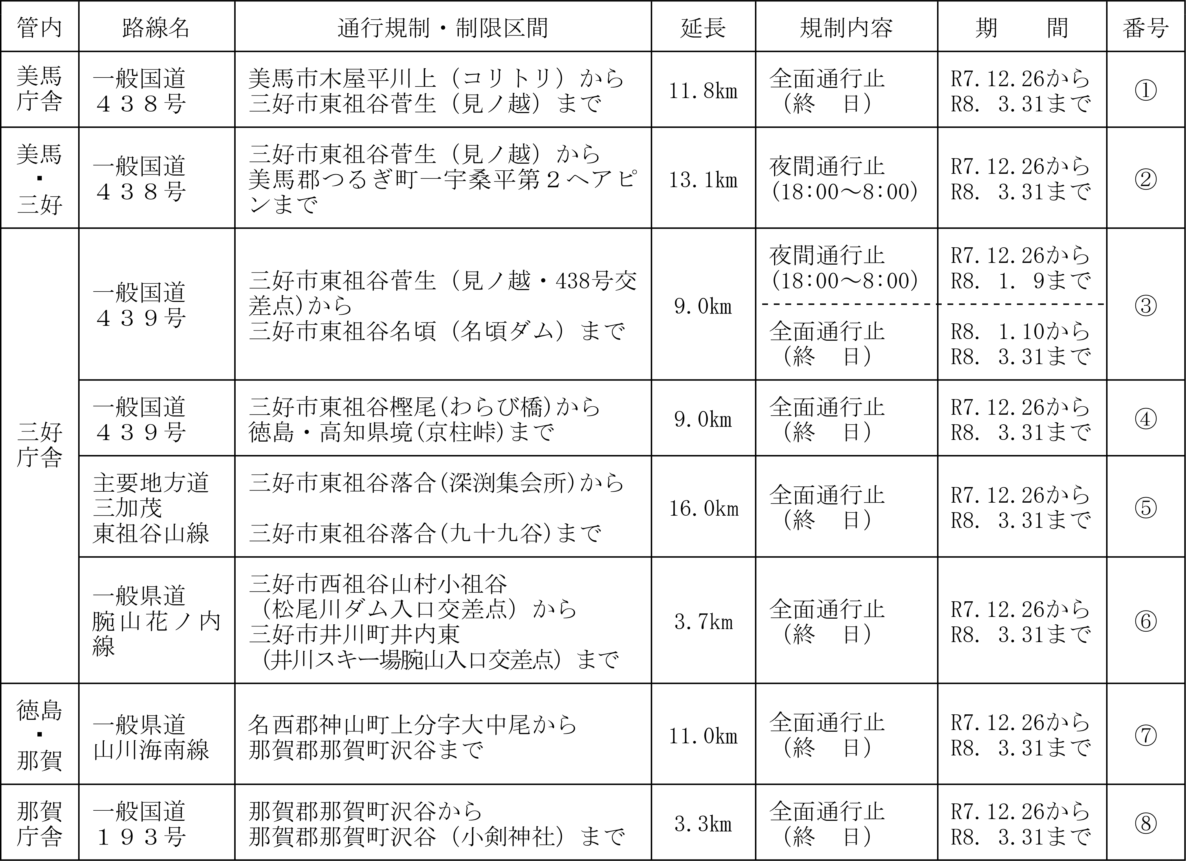 徳島県では、冬期における積雪や路面凍結により、県管理道路(国道・県道)において車両等の安全な通行を確保することが困難となるため、次のとおり通行規制を行います。