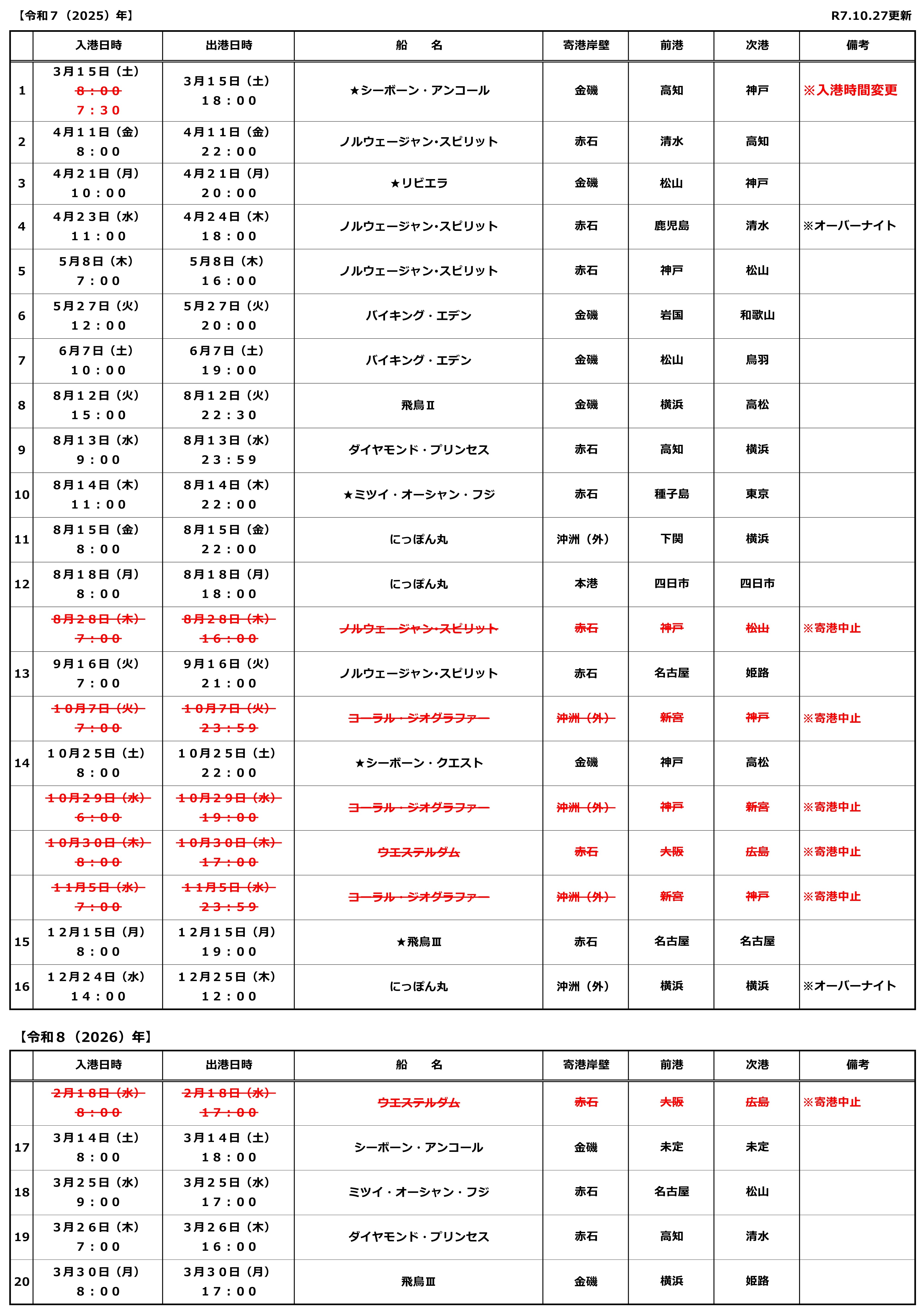 今後、寄港予定の追加や変更があり次第、随時ホームページでお知らせします。