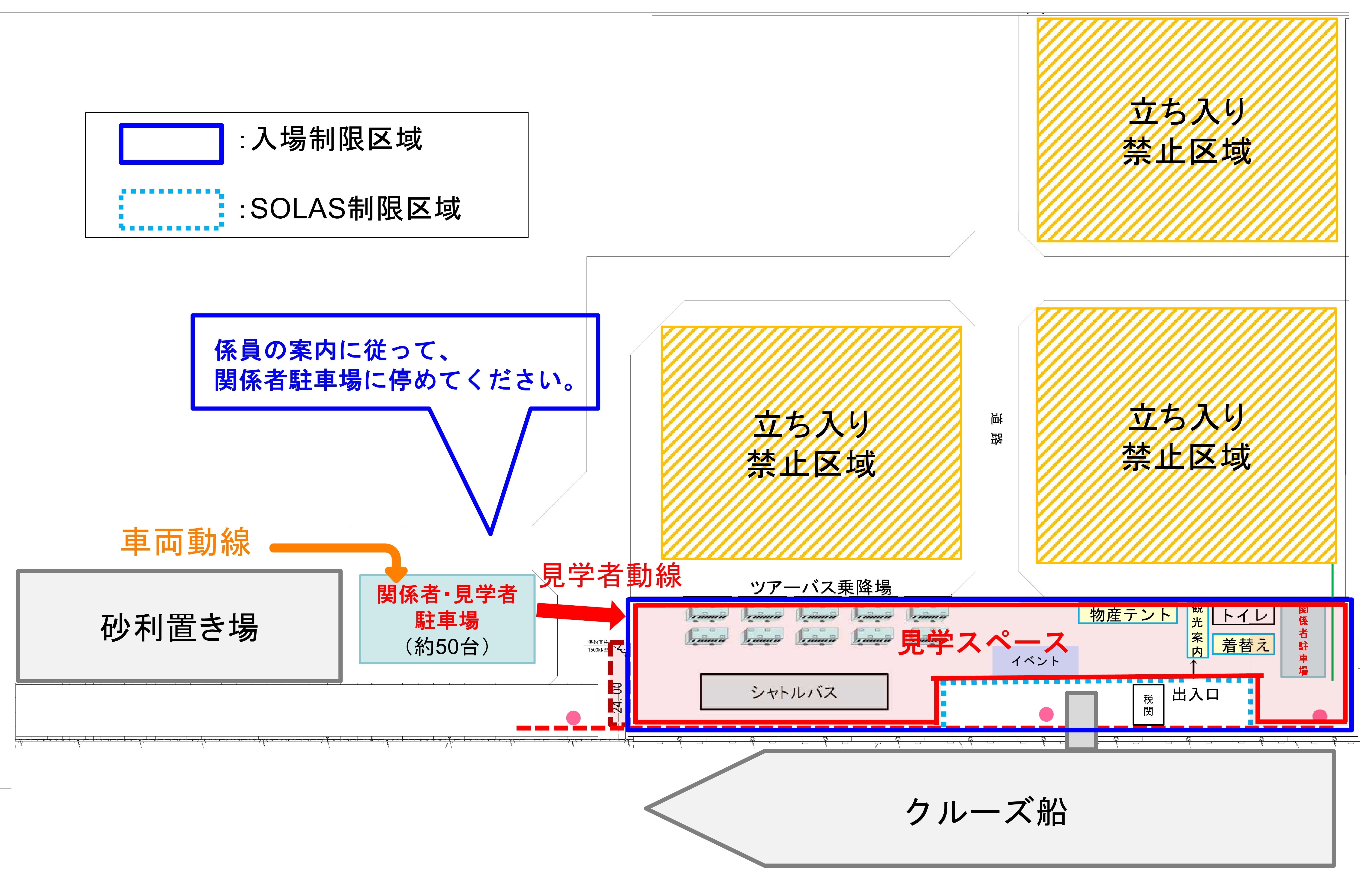 2.停泊場所周辺は、「立ち入り制限区域(SOLAS制限区域※)」があるため、保安上、入場制限を設けております。(上記会場案内図を参照)