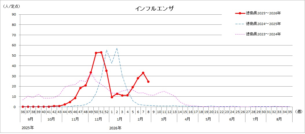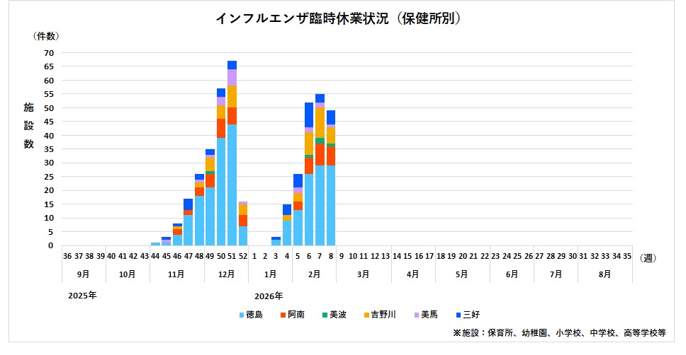 第8週は、徳島保健所管内で休校1件、学年閉鎖13件、学級閉鎖15件、阿南保健所管内で学年閉鎖3件、学級閉鎖4件、美波保健所管内で学年閉鎖1件、吉野川保健所管内で学年閉鎖5件、学級閉鎖1件、美馬保健所管内で学年閉鎖1件、三好保健所管内で学年閉鎖4件、学級閉鎖1件でした。