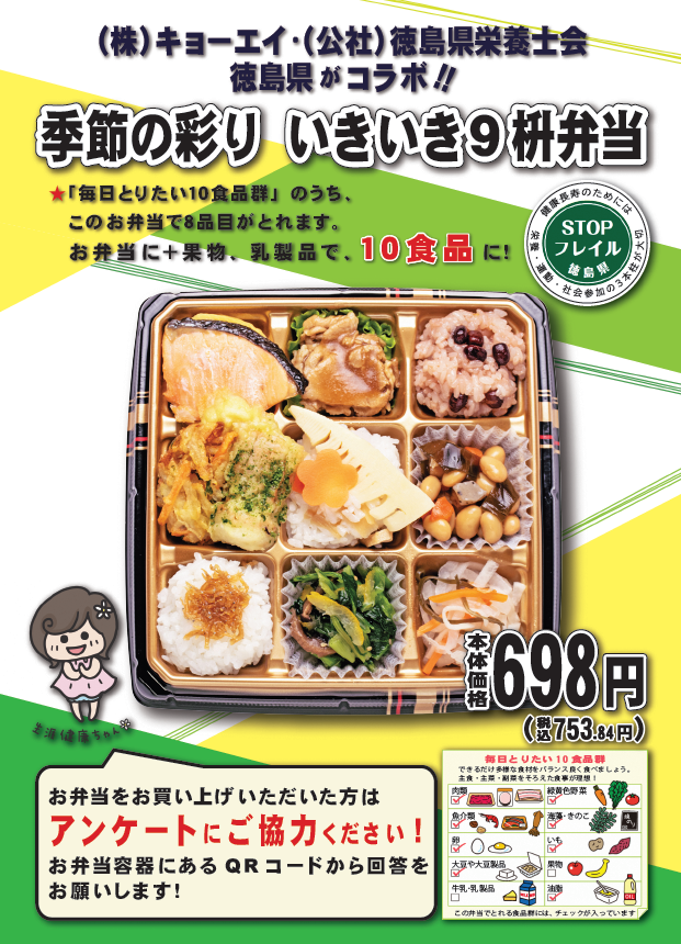 昨年度に引き続き、(株)キョーエイ、(公社)徳島県栄養士会、徳島県がコラボし、フレイル予防に役立つ食生活に関する情報発信として、「季節の彩りいきいき9枡弁当」の発売します。