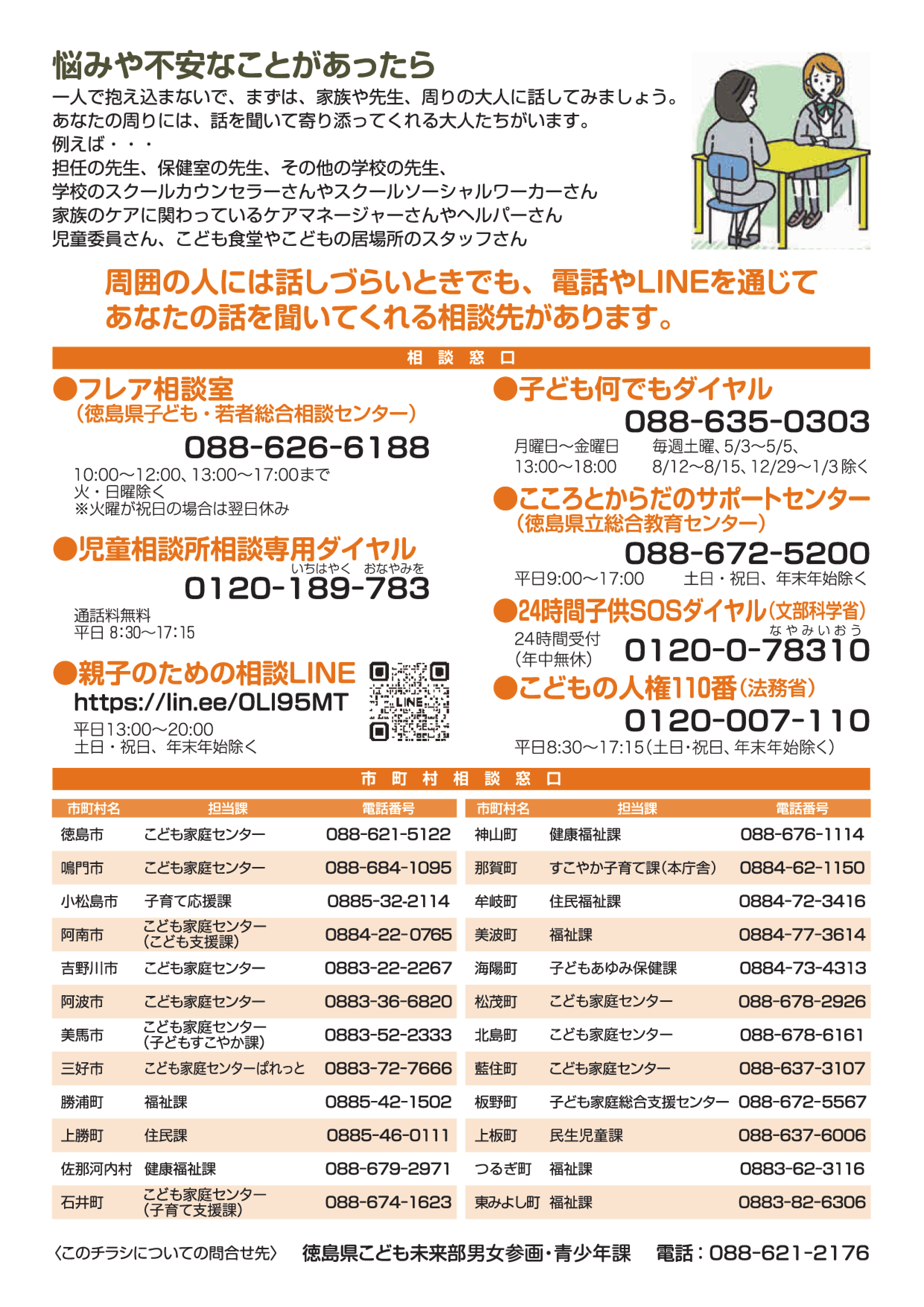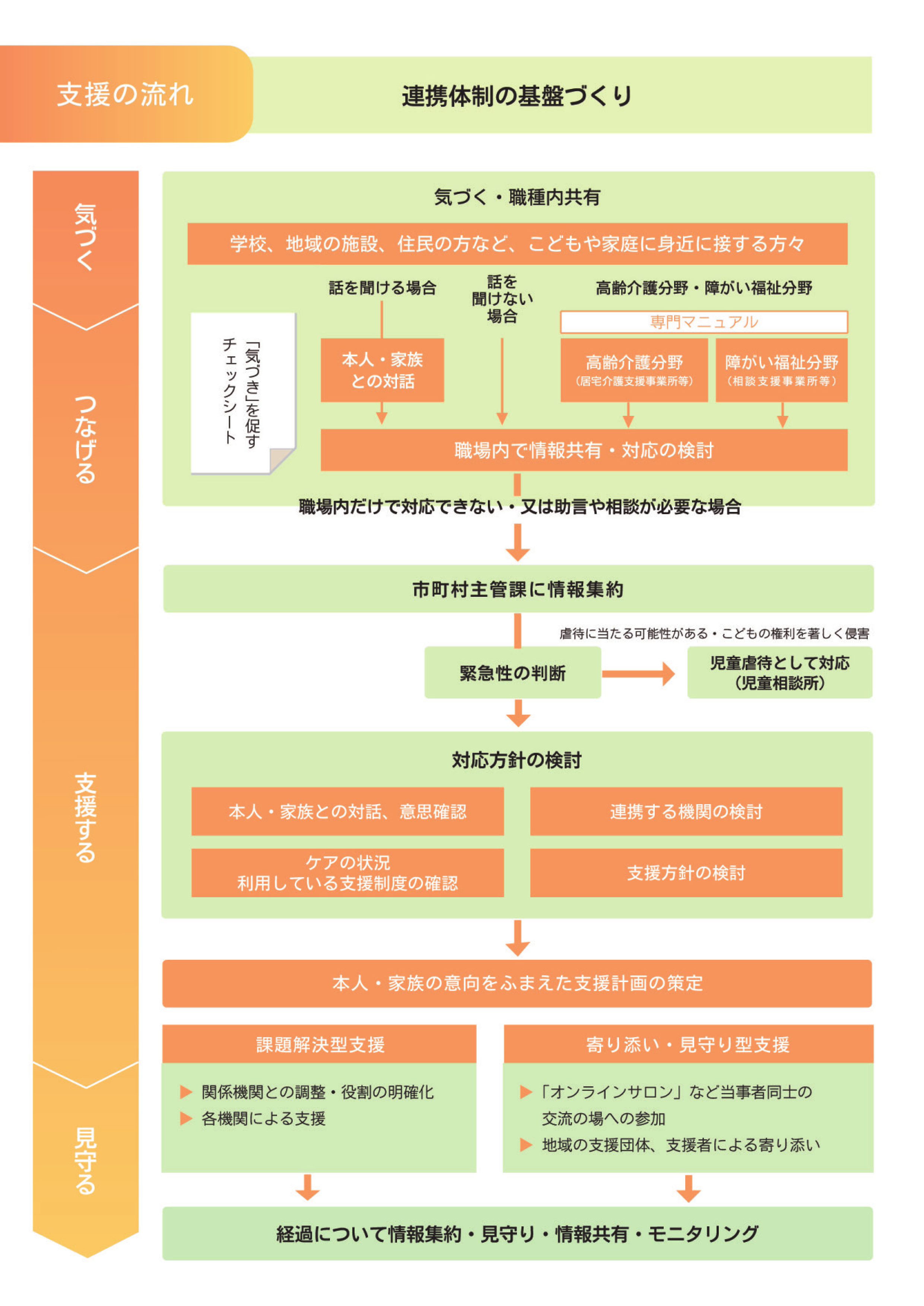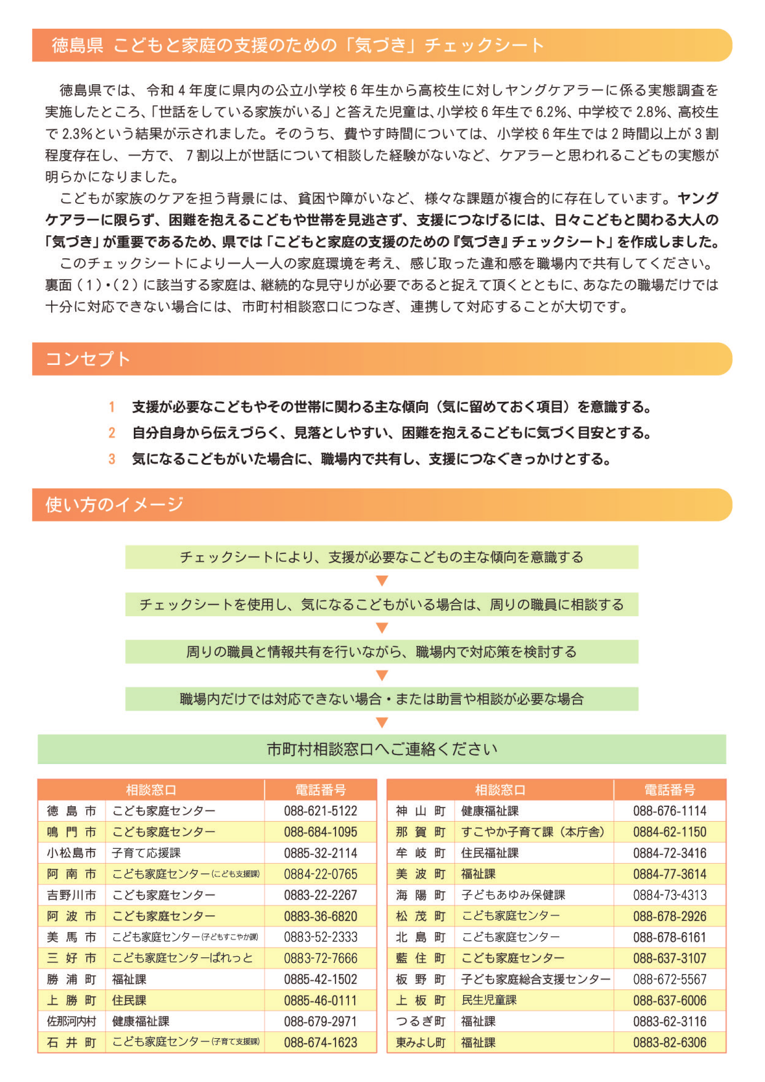 支援が必要なこどもに「気づく」視点の参考として頂くとともに、一人一人の家庭環境を考え、感じ取った違和感を職場内で共有し、自機関以外の支援が必要な場合、又は助言や相談が必要な場合においては、市町村相談窓口に連絡の上、連携して対応して頂きますようよろしくお願いいたします。