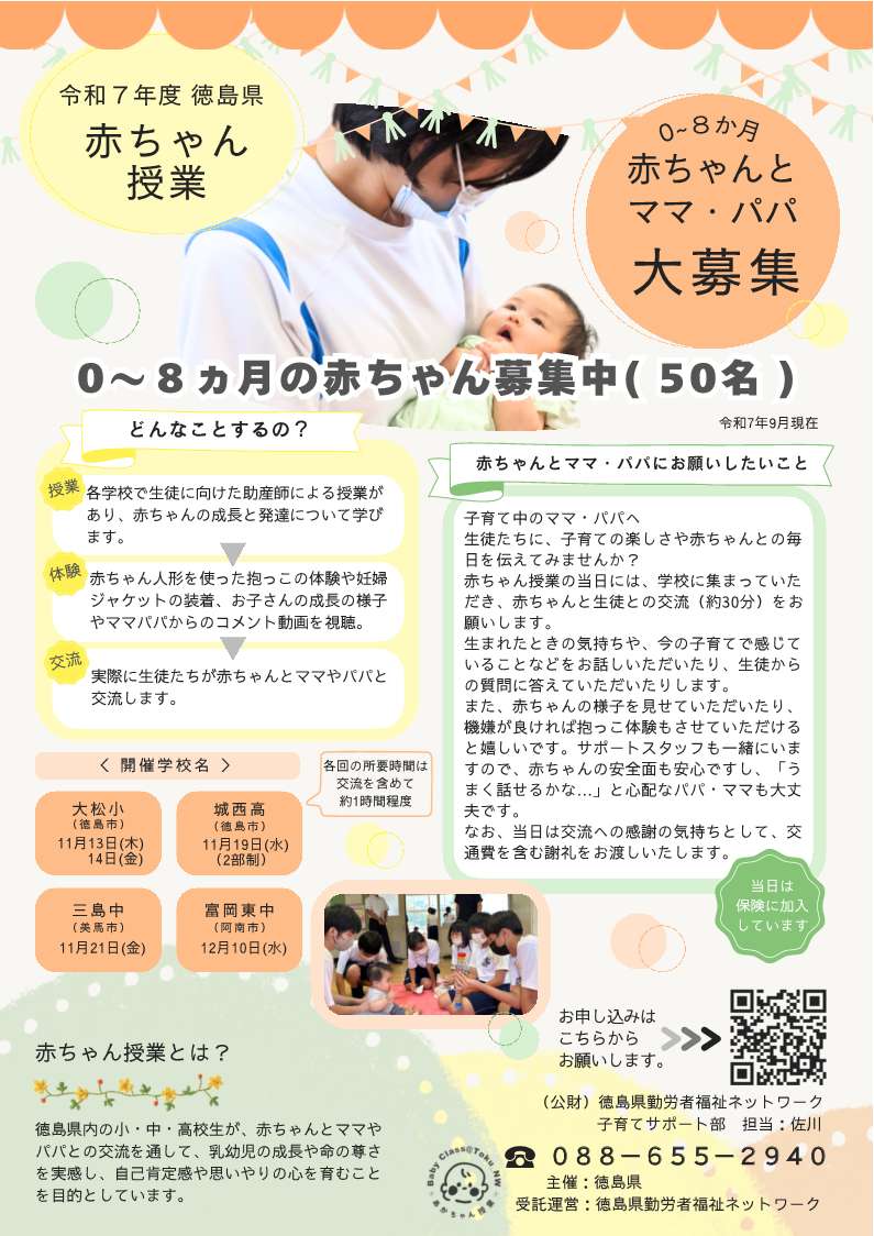 徳島県下の小中高生が、赤ちゃんとママやパパとの交流体験を通して、乳幼児の成長や命の尊さを実感し、将来のライフプランについて考る機会につなげることを目的としています。
