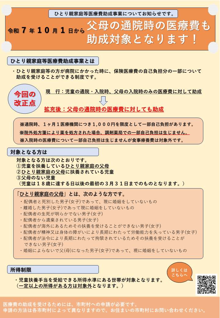 これまで、児童の通院・入院時、父母の入院時のみの医療費を助成対象としていましたが、令和7年度10月1日より新たに父母の通院時の医療費に対しても助成対象となります。