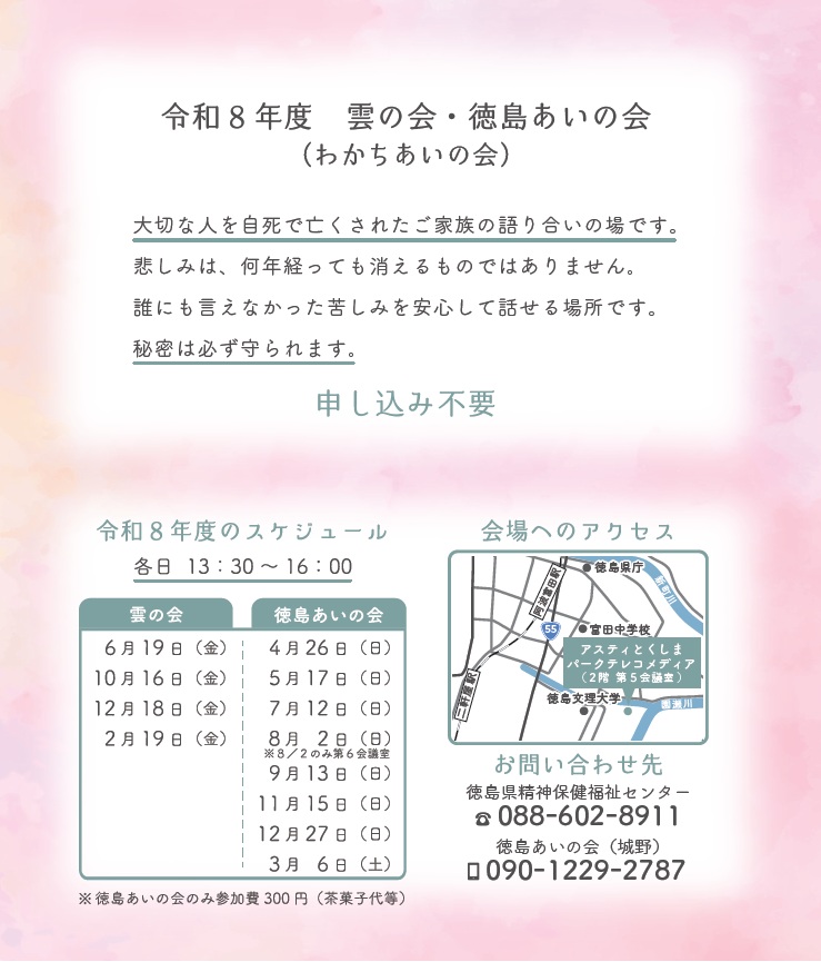 令和8年度の「わかちあいの会」の日程が決まりました。県主催の「雲の会」と、自助グループ「徳島あいの会」の共催で開催しております。詳しくは添付ファイルを御覧ください。また、こちらを名刺サイズのカードにしたものを当センターや県関係機関、社会福祉協議会、精神科医療機関、市町村等で配布する予定です。必要な方は当センターまでお問い合わせください。