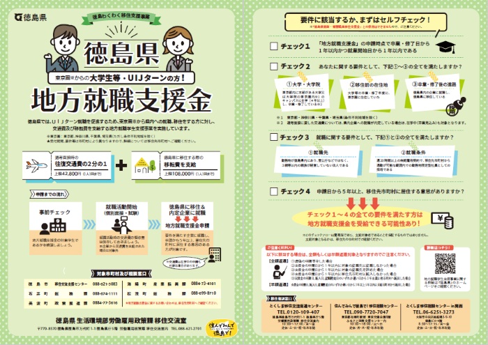 徳島県では、東京圏(※)からのUIJターンや若者の移住促進、地方の担い手不足の解消に向け、移住を伴う就業・起業者、学生等に対して、移住者の負担軽減を支援するための事業を実施しています。