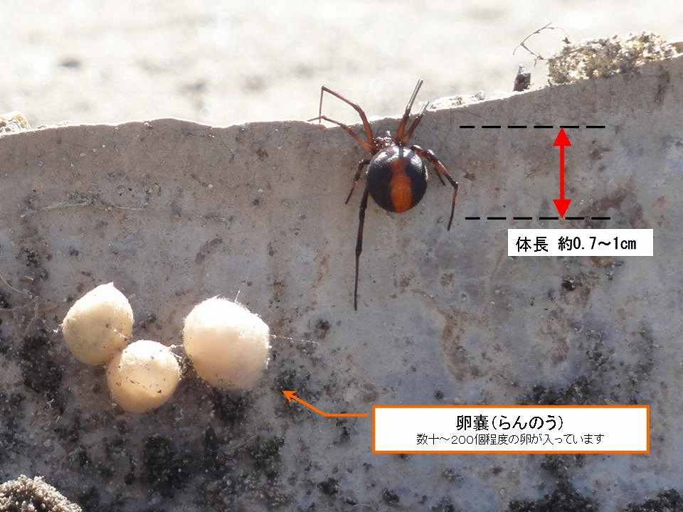 (1)攻撃的なクモではありませんが、メスは神経毒をもっているため、咬まれた場合、局所の疼痛、熱感程度の症状があり、小児、高齢者等の人が咬まれると、まれに重症化することがあります。(オスは毒をもっていません。)