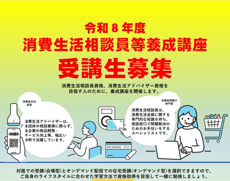 消費生活相談員資格、消費生活アドバイザー資格を目指す人のために、養成講座を開催いたします。