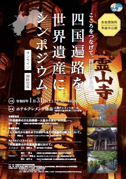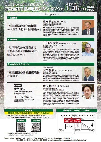このたび、四国遍路の世界遺産登録に向けて、有識者を招いて、基調講演やパネルディスカッション等を内容とするシンポジウムを開催いたします。