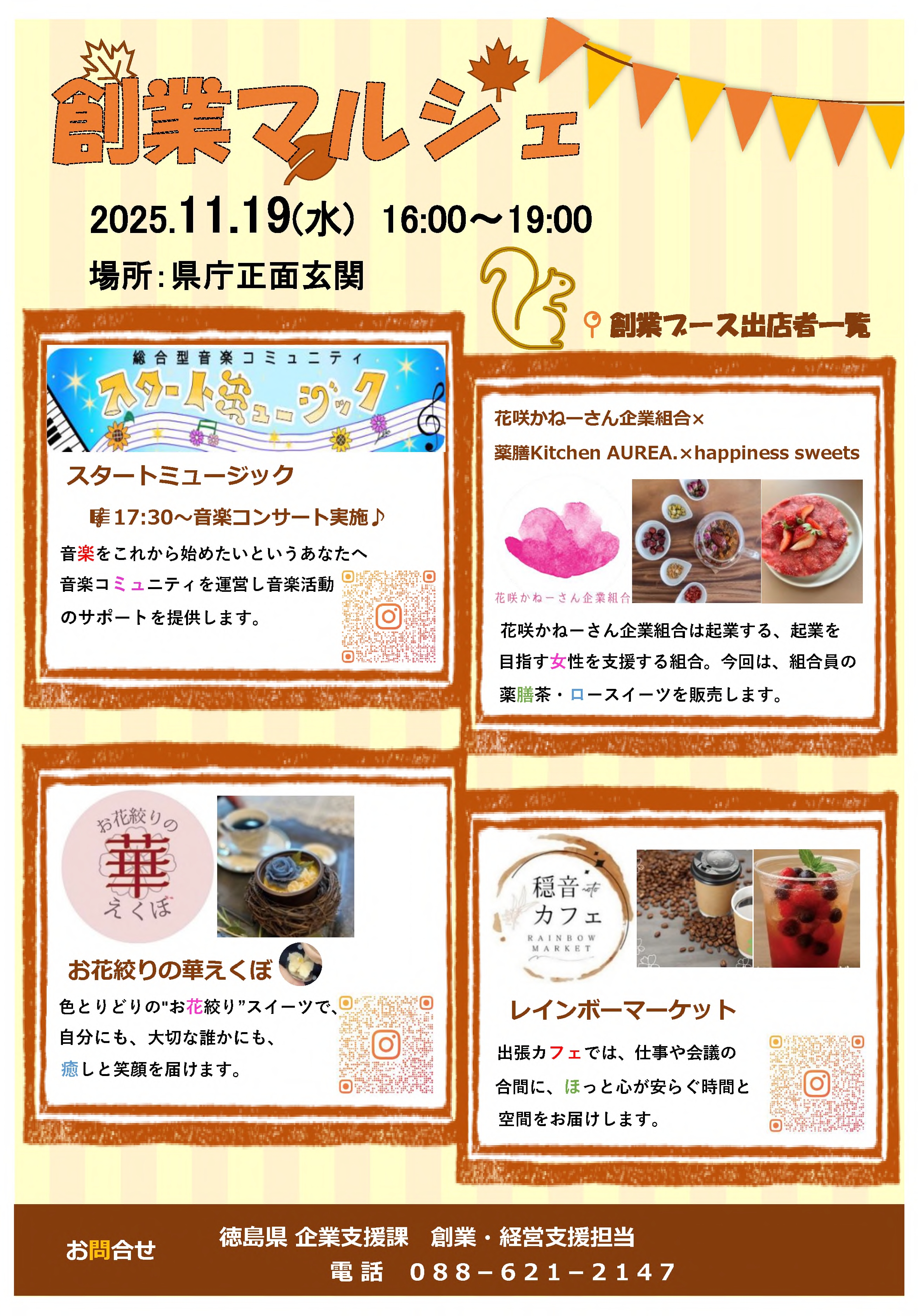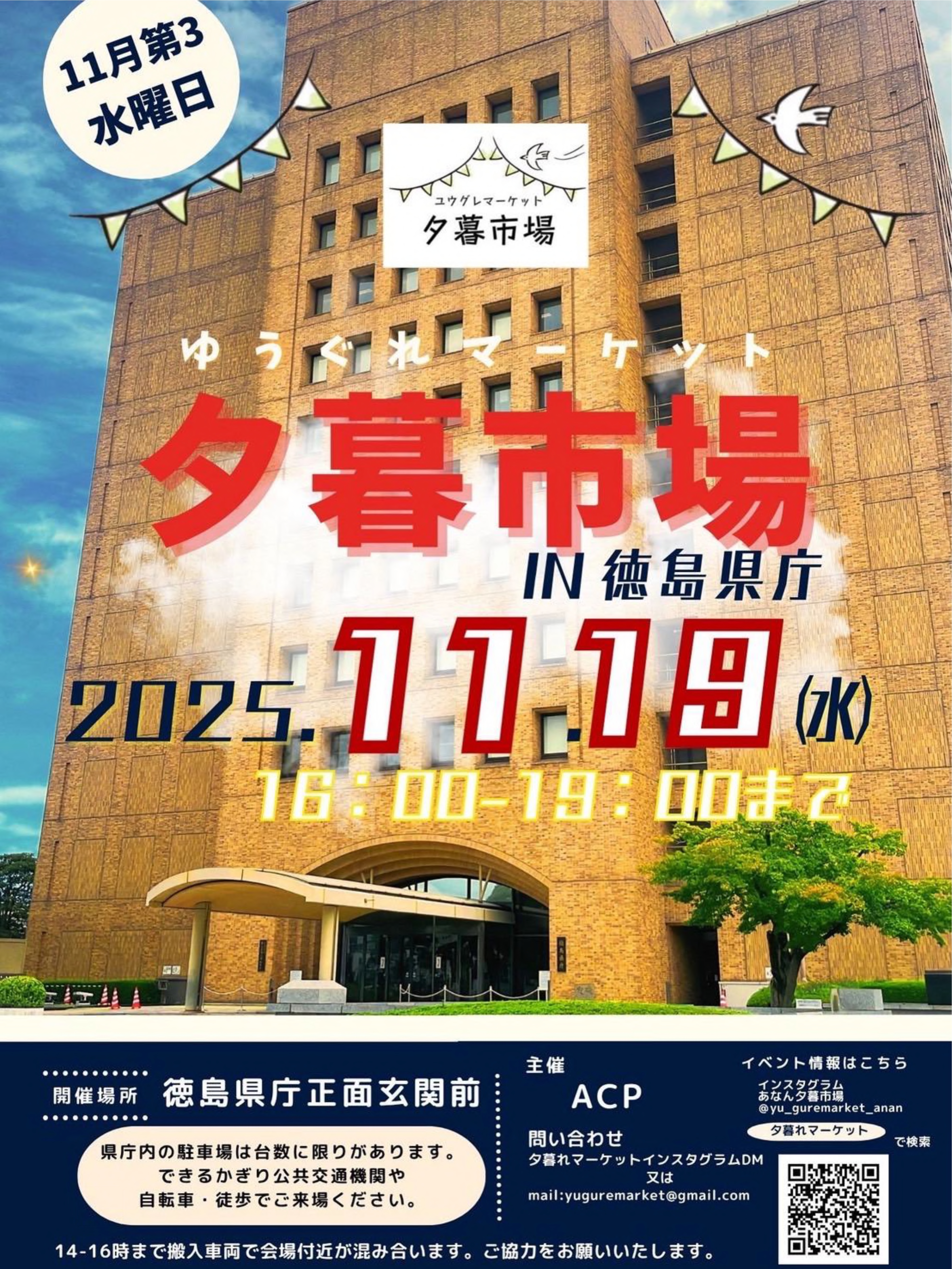 この度、「県庁オータムマルシェ」として、県庁正面玄関前ロータリー及び西側広場にて「夕暮れマーケットin徳島県庁」を、正面玄関にて「創業マルシェ」を開催します。