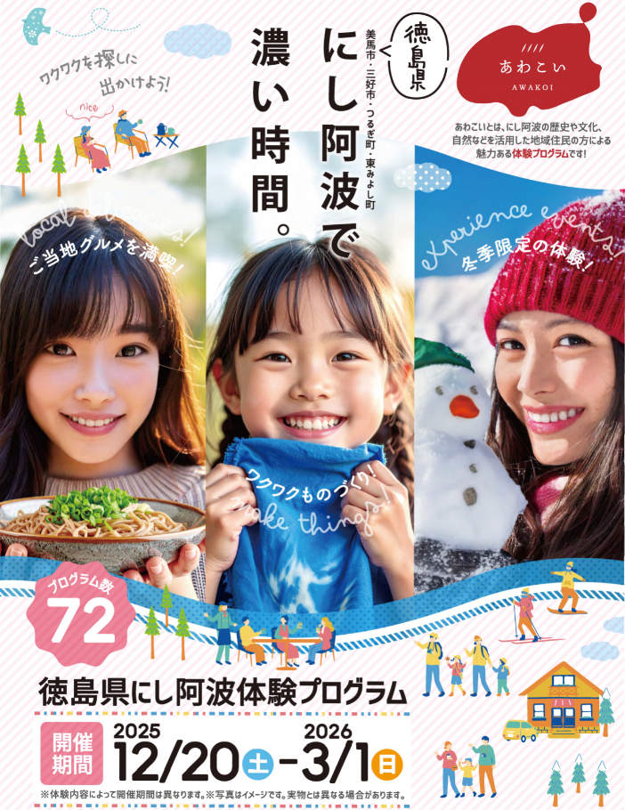 あわこいとは、徳島県西部の「にし阿波~剣山・吉野川観光圏(美馬市・三好市・つるぎ町・東みよし町)」で2012年(平成24年)から期間限定で開催している体験プログラムイベントです。