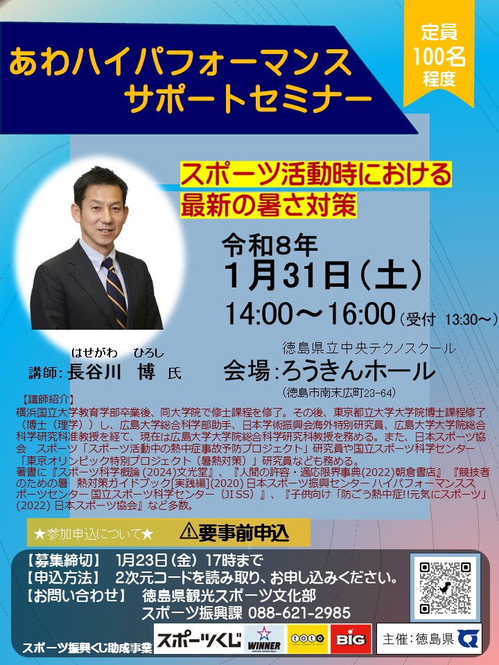 今回の講演は、スポーツ活動全般における熱中症予防に繋がるテーマとなっていますので、興味関心のある皆様の参加をお待ちしております。