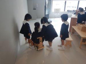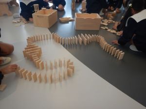 子ども用テーブル・ベンチセット、乳母車、木馬、くねくねタワー、森の機関車、本棚、ドミノ、積み木