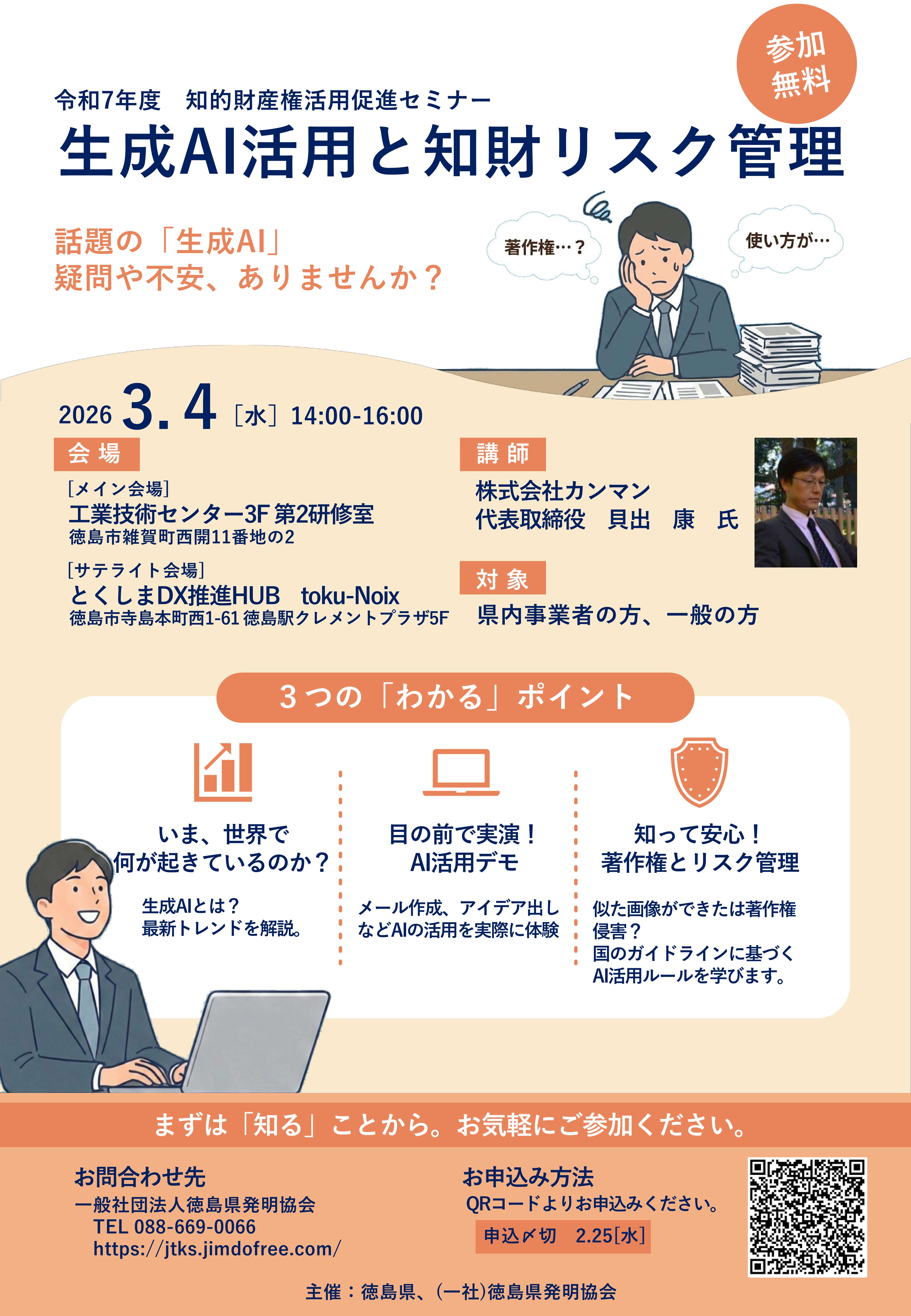 徳島県及び(一社)徳島県発明協会では、知的財産権活用促進セミナーを次のとおり開催します。