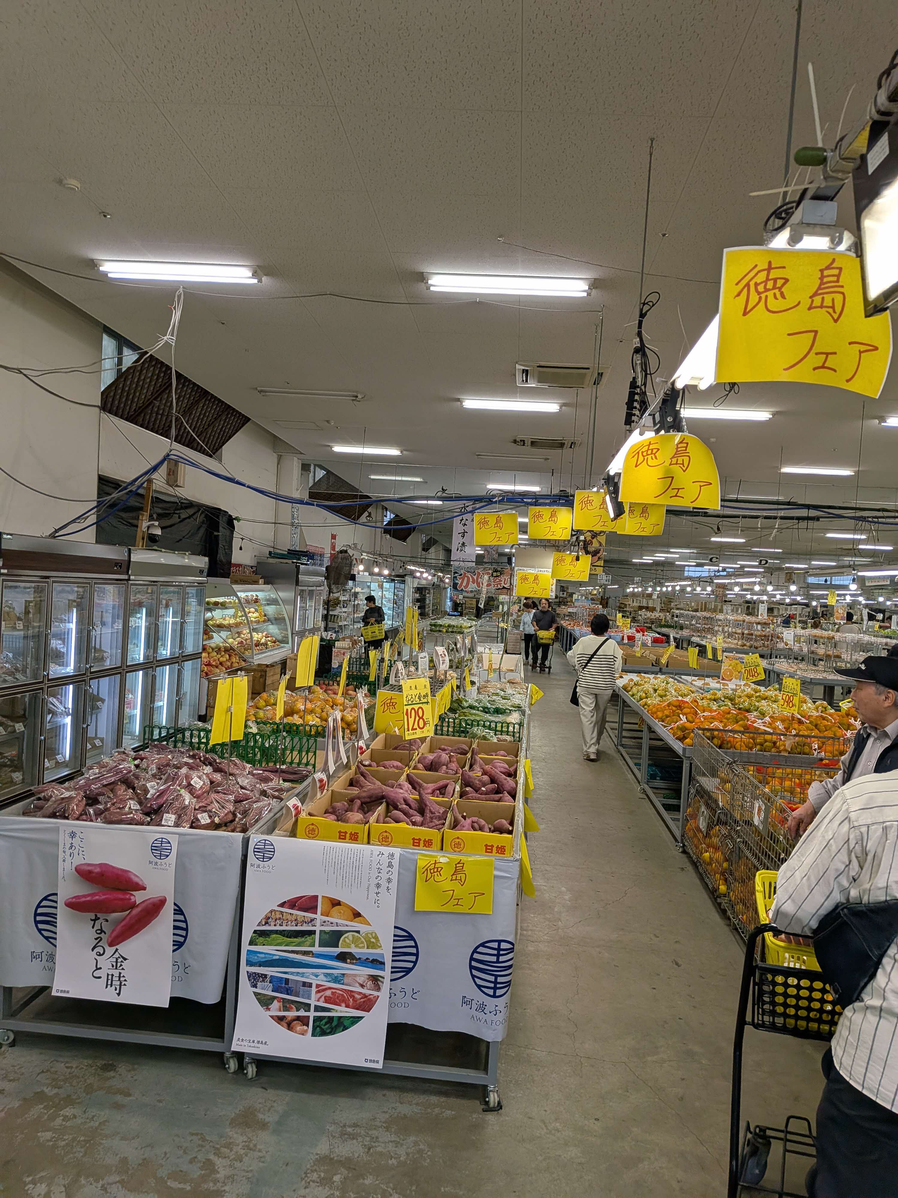 10月26日に国華園二色の浜店において、徳島県フェアが開催され、店舗内に徳島県産農産物の販売コーナーが設置されたほか、「新鮮! なっとくしま」号での「なると金時」や「レンコン」を使った試食配布、大阪天水連による阿波おどり演舞やすだちくんのジャンケン大会などを実施しました。