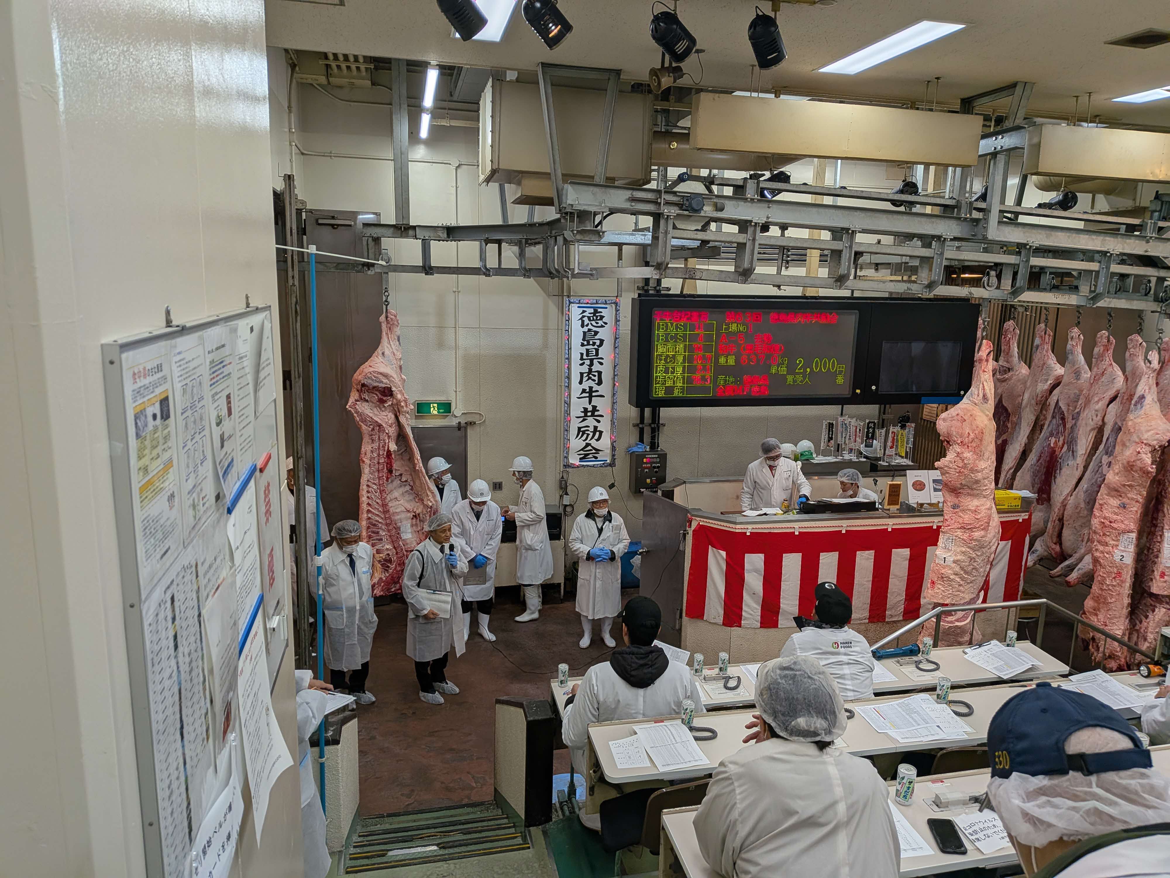 11月14日には、第63回徳島県肉牛共励会が大阪市中央卸売市場南港市場で開催され、県内17の生産者から和牛、交雑牛合わせて35頭の肉牛が出品され、和牛の部では「四国三郎牛」北谷昌也氏、交雑牛の部では「四国三郎牛」ノースバレー株式会社がそれぞれ最優秀賞に選ばれました。セリ前には、主催者を代表し、徳島県肉用牛振興協会の常務理事窪裕司氏より購買者へ徳島県産牛の積極的な購買を呼びかけました。
