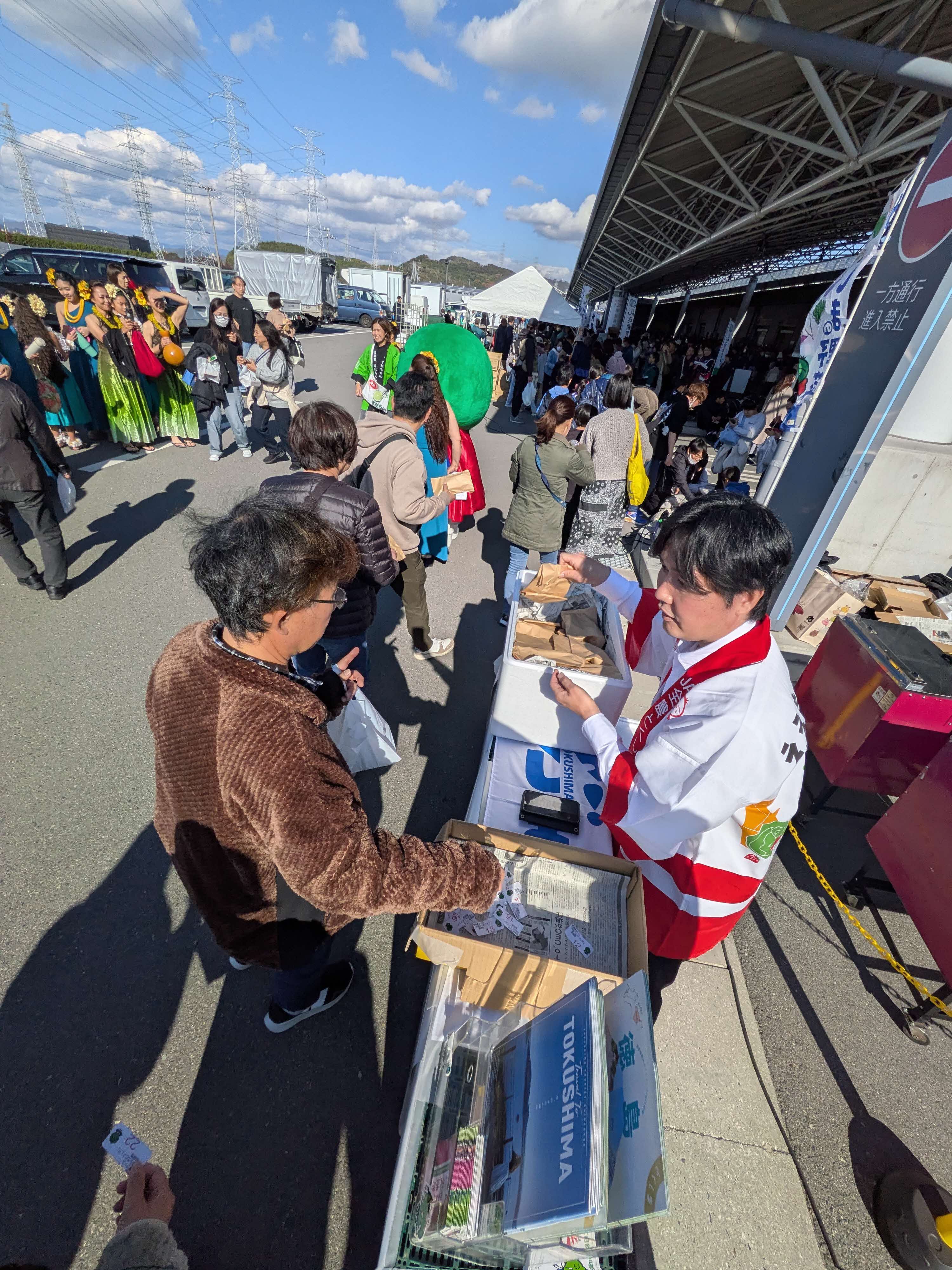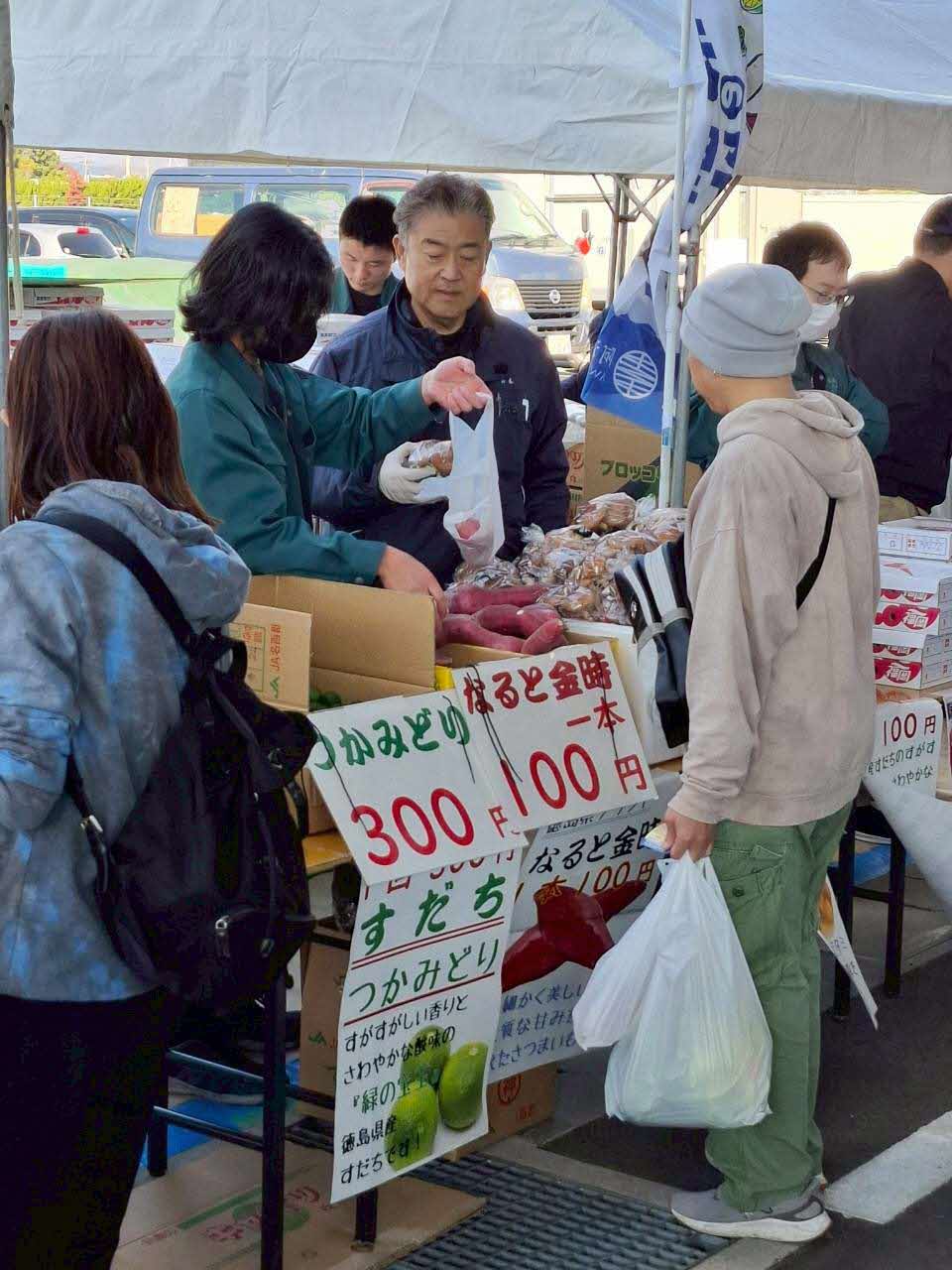 11月29日には、姫路市中央卸売市場において、姫路市場大感謝祭が開催され、徳島県産農産物の販売、なると金時の焼き芋の無料試食配布やすだちくんのじゃんけん大会を実施し、来場いただいた方々に徳島県産農産物のPRを行いました。