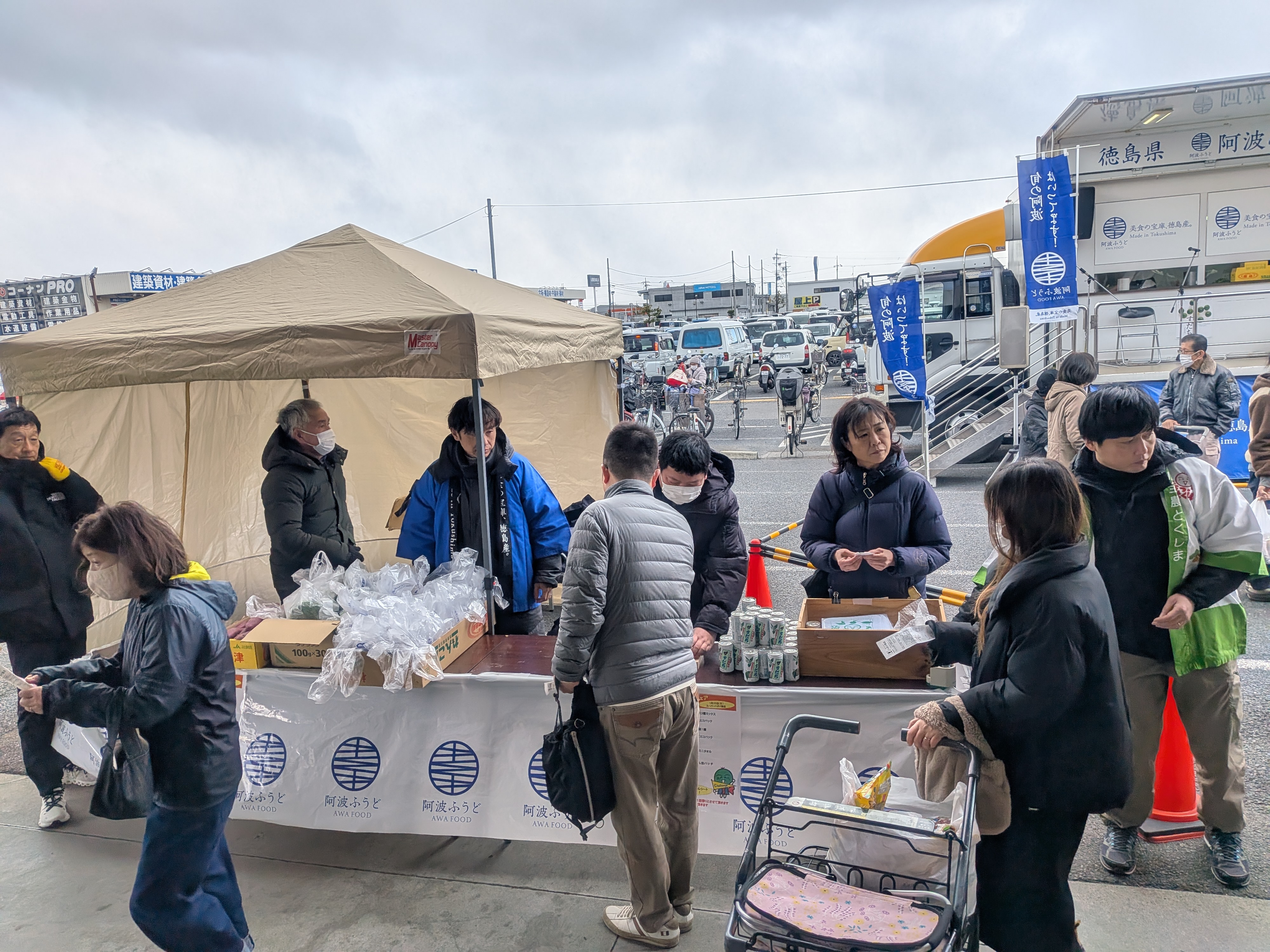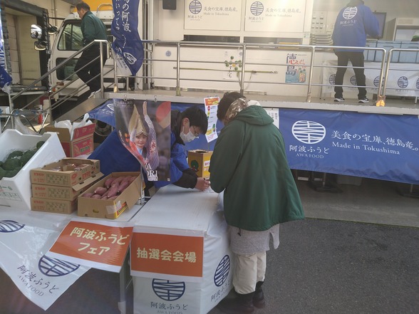 1月24日、和歌山県の「スーパーエバグリーンプラス和歌山北インター店」にて「阿波ふうどフェア」を開催しました。会場では徳島県産の農産物販売に加え、キッチンカー「新鮮 なっ!とくしま」号による県産食材を使った料理の試食配布、さらに「すだちくん」とのじゃんけん大会など、多彩なプログラムで徳島の食をPRしました。