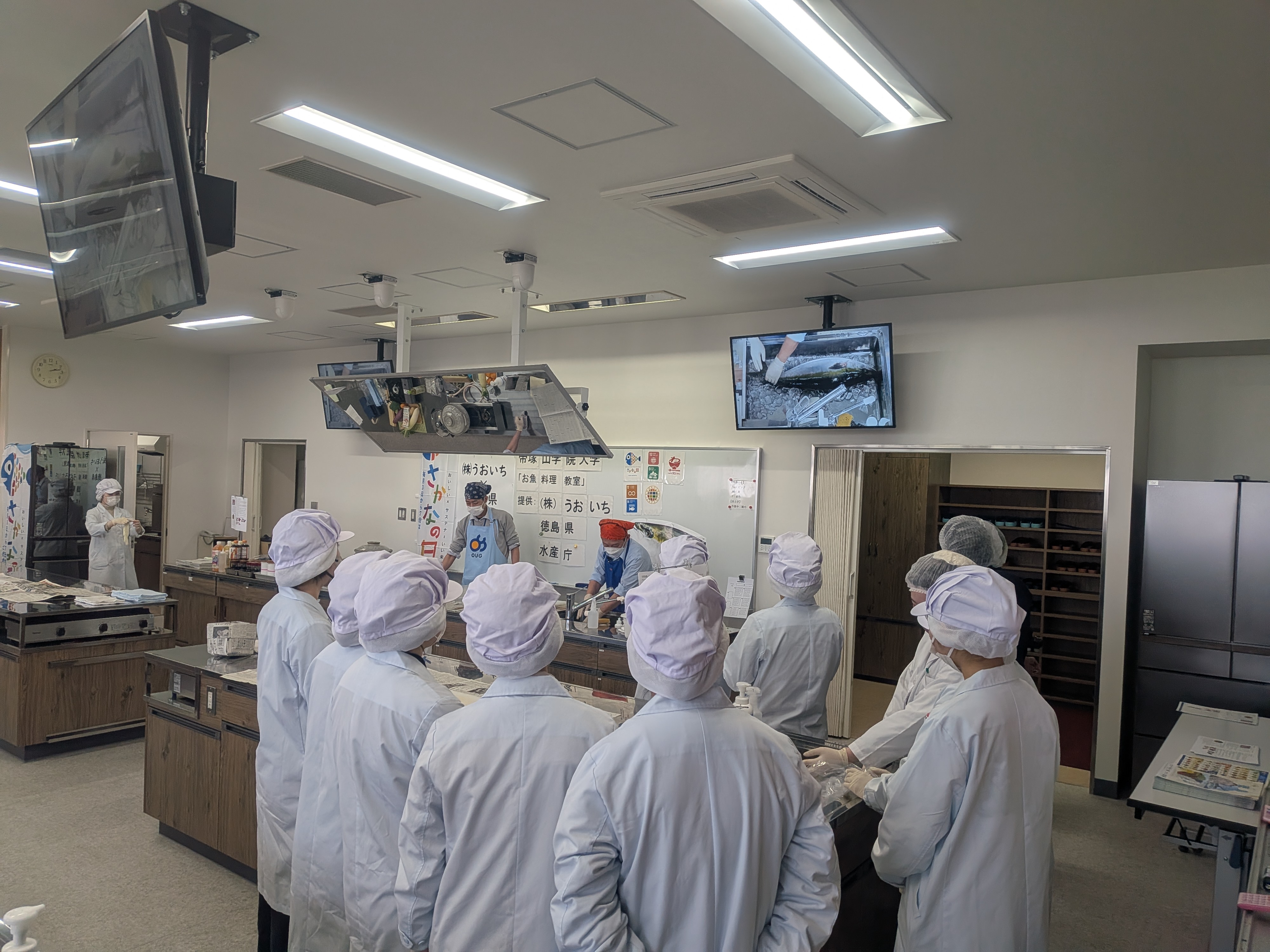 2月2日、3日の両日、帝塚山学院大学において「すだちブリ」をはじめとした水産物や県産農産物を用いた料理教室が開催されました。参加した1〜3年生の学生たちは、おろし方の講習を受けながら実際に2班で1尾ずつ「すだちブリ」を捌く作業に挑戦しました。初めての体験に戸惑いを見せつつも、学生たちは真剣な面持ちで取り組み、調理後には県産農産物をふんだんに使った料理を試食してその魅力を堪能しました。