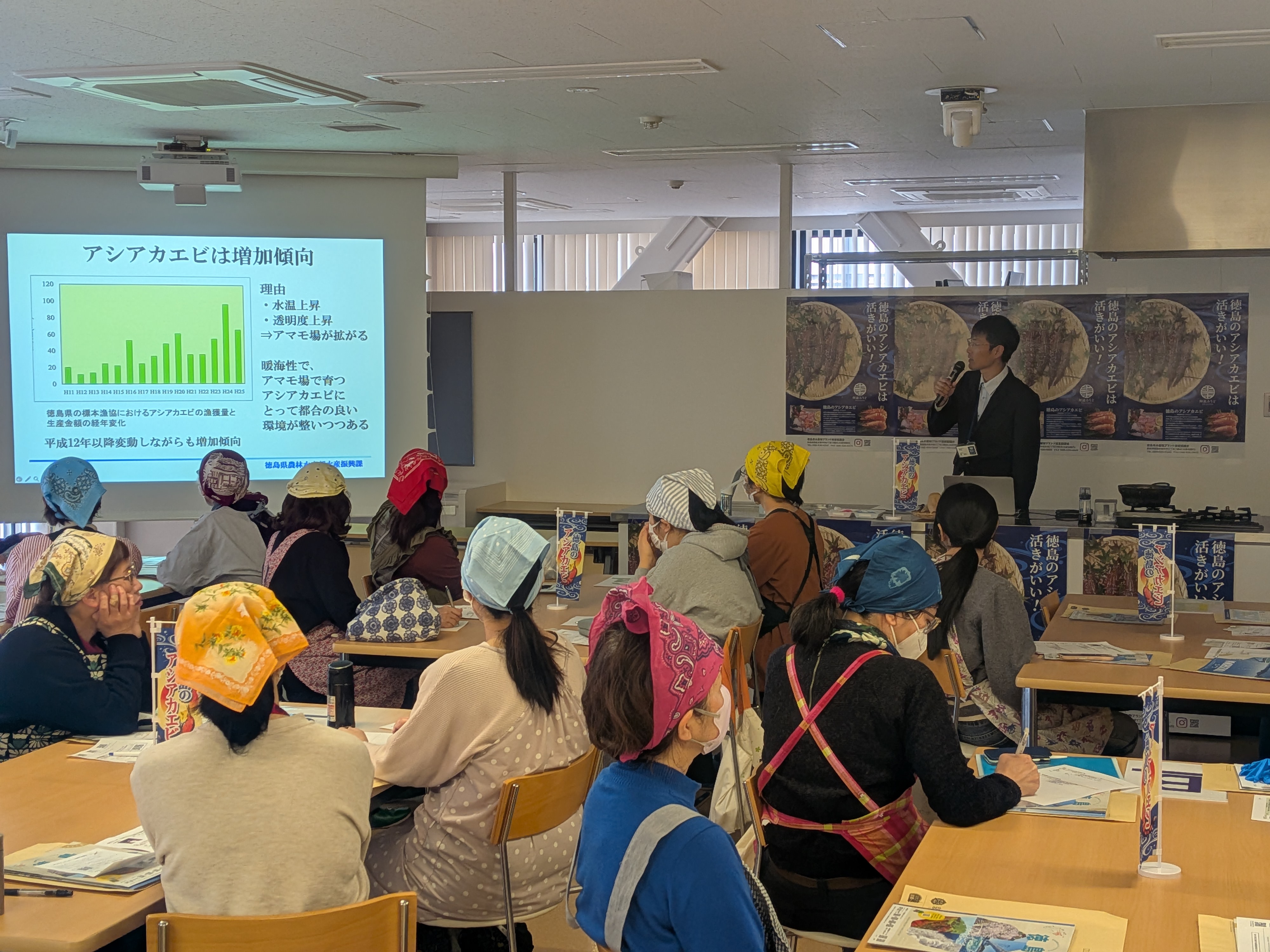 続く23日には、京都市中央卸売市場の「あじわい館」にて、県のブランド水産物である「アシアカエビ」の料理教室が行われました。参加者は「アシアカエビ」や県産農産物についての紹介を受けたほか、実際の漁の様子を収めた映像を視聴し、その後の調理実習に臨みました。質疑応答では「アシアカエビ」の購入場所や徳島県に関する質問が活発に飛び交うなど、大変盛況な会となりました。