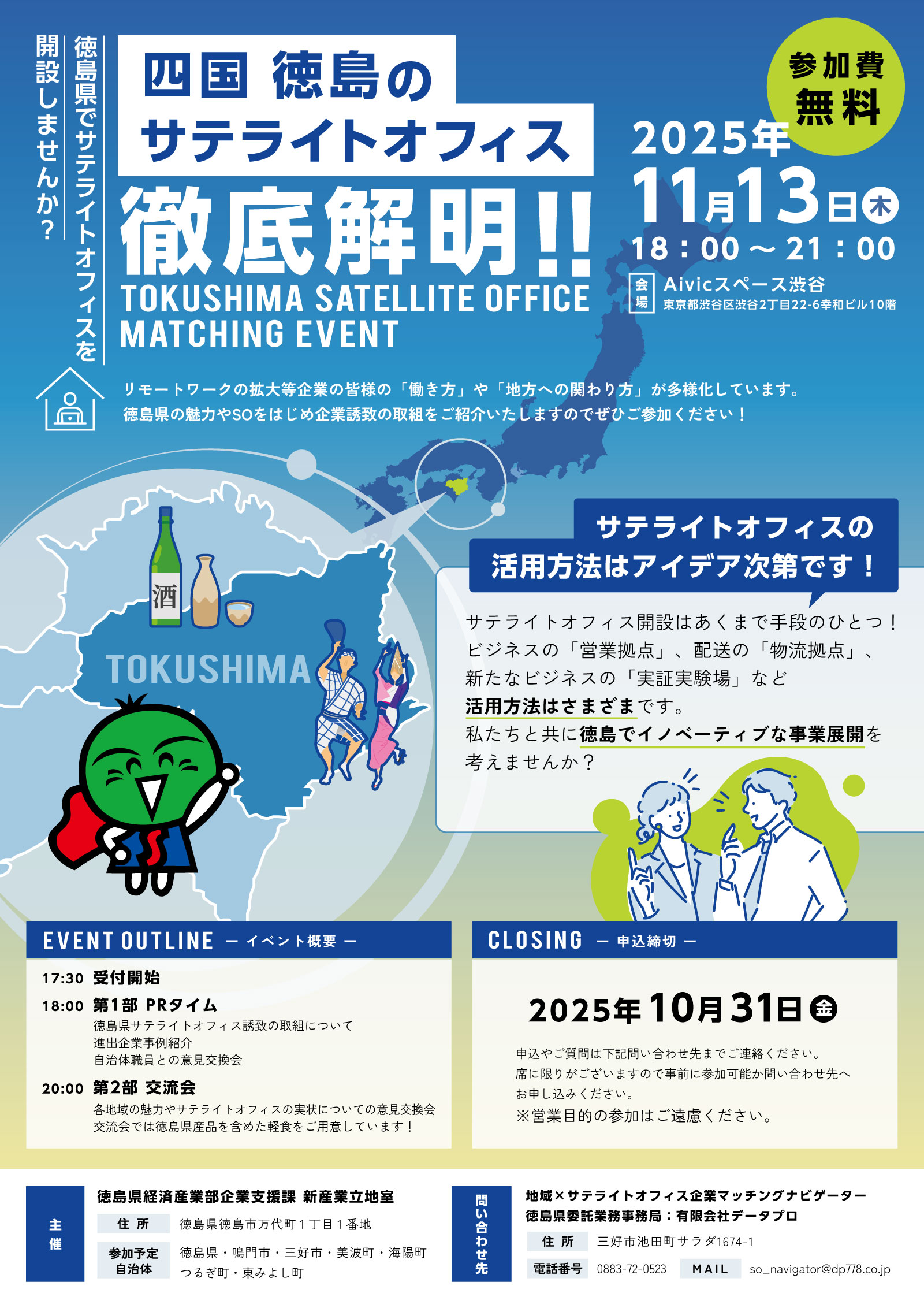 次のとおり、サテライトオフィスマッチングイベントを開催します。