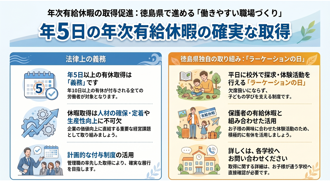 「有給休暇を取りたいと言い出しにくい」「制度はあるのに取得させてもらえない」など、休暇の取得に関するお悩みや、その他の労働問題については、下記徳島労働局HPの「総合労働相談コーナー」へご相談ください。