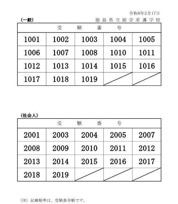令和8年1月30日に実施した令和8年度総合看護学校「准看護学科」一般入学試験及び社会人入学試験の合格者は、次のとおりです。 合格者には、合格発表日の午後に「合格通知」を発送します。 不合格者には不合格通知を発送しません。本掲示をもって代えさせていただきます。