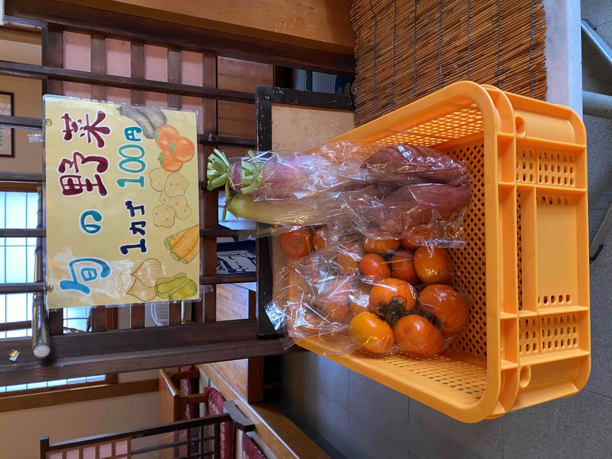 自家栽培や地元産の野菜を使用したお惣菜が並びます。店舗の中には、旬の野菜や果物も販売しています。