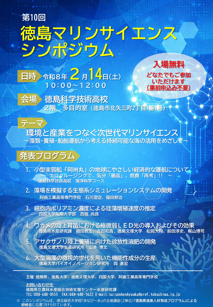 徳島県(徳島科学技術高等学校)、徳島大学、徳島文理大学、四国大学及び阿南工業高等専門学校は「徳島県水産業の成長産業化及び関連産業の振興に関する協定」に基づき、相互連携による人材育成や研究開発を推進する「マリンサイエンスゾーン」を構成しており、毎年、研究成果を当シンポジウムにて紹介しています。