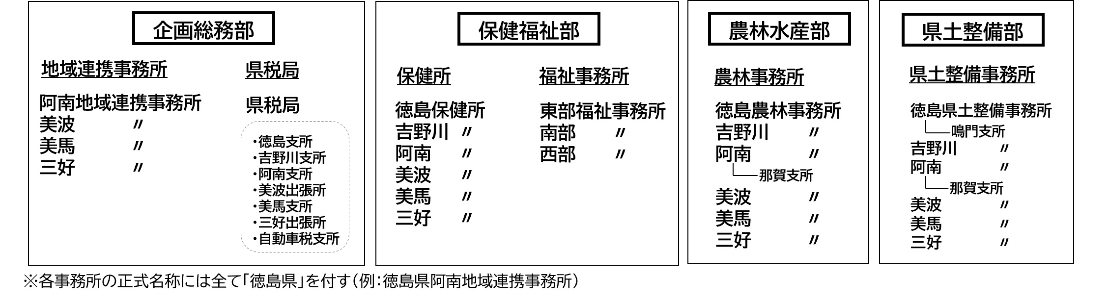 (1)本庁と現場の役割を明確化し、よりスピーディーな行政運営体制を構築するため、予算及び政策企画部門を本庁へ集約化し、部直轄の事務所等へと再編します