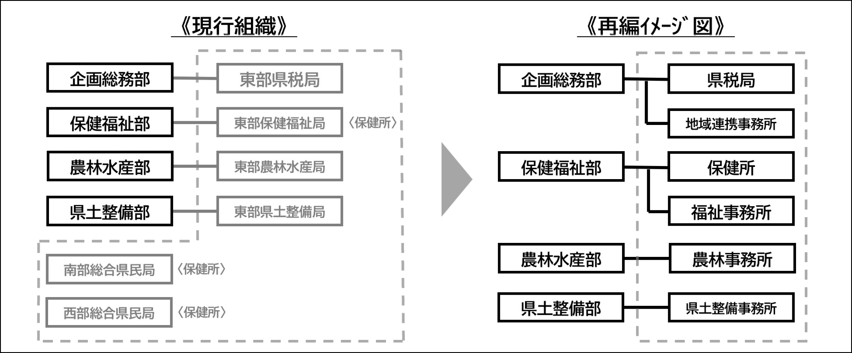 (2)県民目線で身近な地域の窓口機能等の確保・向上のため、ワンストップ型で分かりやすい組織体系へと再編します