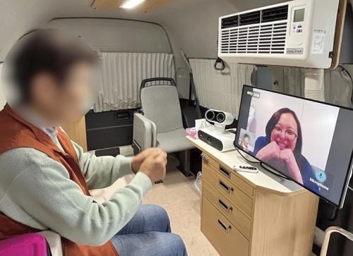 車の中は、まるで小さな診察室。看護師が皆様の体調や心配ごとを丁寧にお伺いし、車内に設置された大きなモニターを通じて、病院にいる医師と「テレビ電話」でつなぎます。