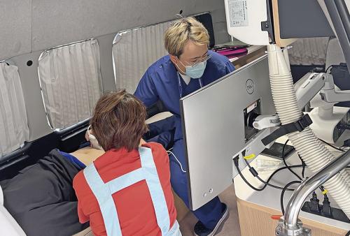 など、高度な検査もその場で受けることができます。看護師が皆様の体に当てた聴診器の音やエコーの映像は、リアルタイムで病院の医師に送られます。