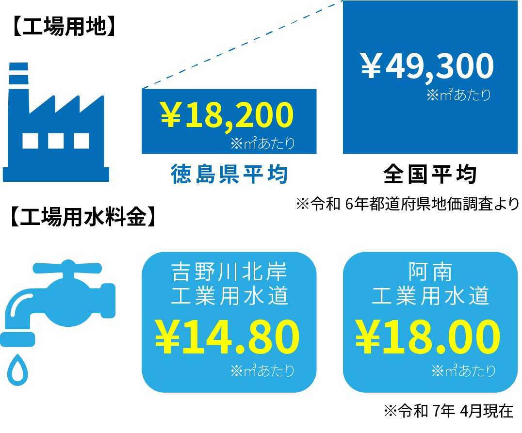コスト削減はあらゆる企業に共通した命題です。徳島県は京阪神エリアから約2時間でアクセスできる好立地にありながら、用地や賃料、用水などの維持費を大幅に抑えられます。固定費の圧縮はそのまま企業の競争力向上に直結し、浮いた予算を設備投資や人材確保へ振り向けることで、競合他社に対する圧倒的な優位性を築くことが可能です。イニシャル・ランニングの両コストを戦略的にコントロールし、事業の成長に専念できる環境を提供します。