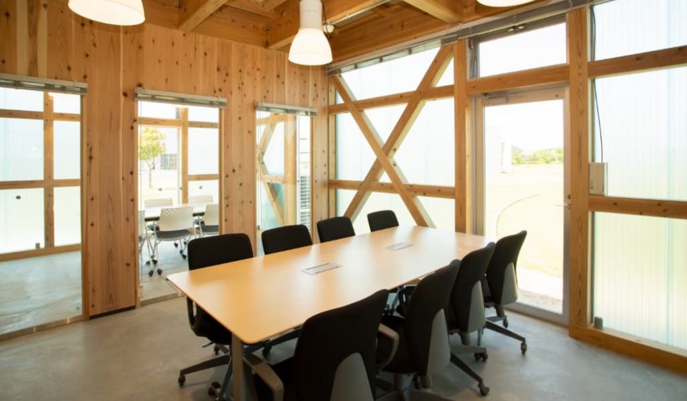 施設は日当たりがよく、徳島県産の杉をふんだんに使用した明るく開放的な空間で、壁掛けモニターを始め、スクリーンやプロジェクター、オンライン会議ができる設備など、最新の機器も備えられています。また、会議室、キッチン、多目的トイレ、テラス、車いす用スロープも完備しています。