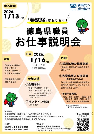 「大学卒業程度(春試験)」の変更点や採用試験の制度概要について理解を深めていただくため、春試験の受験を検討している学生の方や、県職員の仕事に関心のある方を対象とした説明会を開催します。