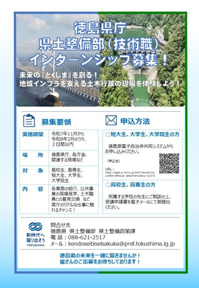 県土整備部技術職(総合土木職・建築職)を対象にインターンシップを実施します。
