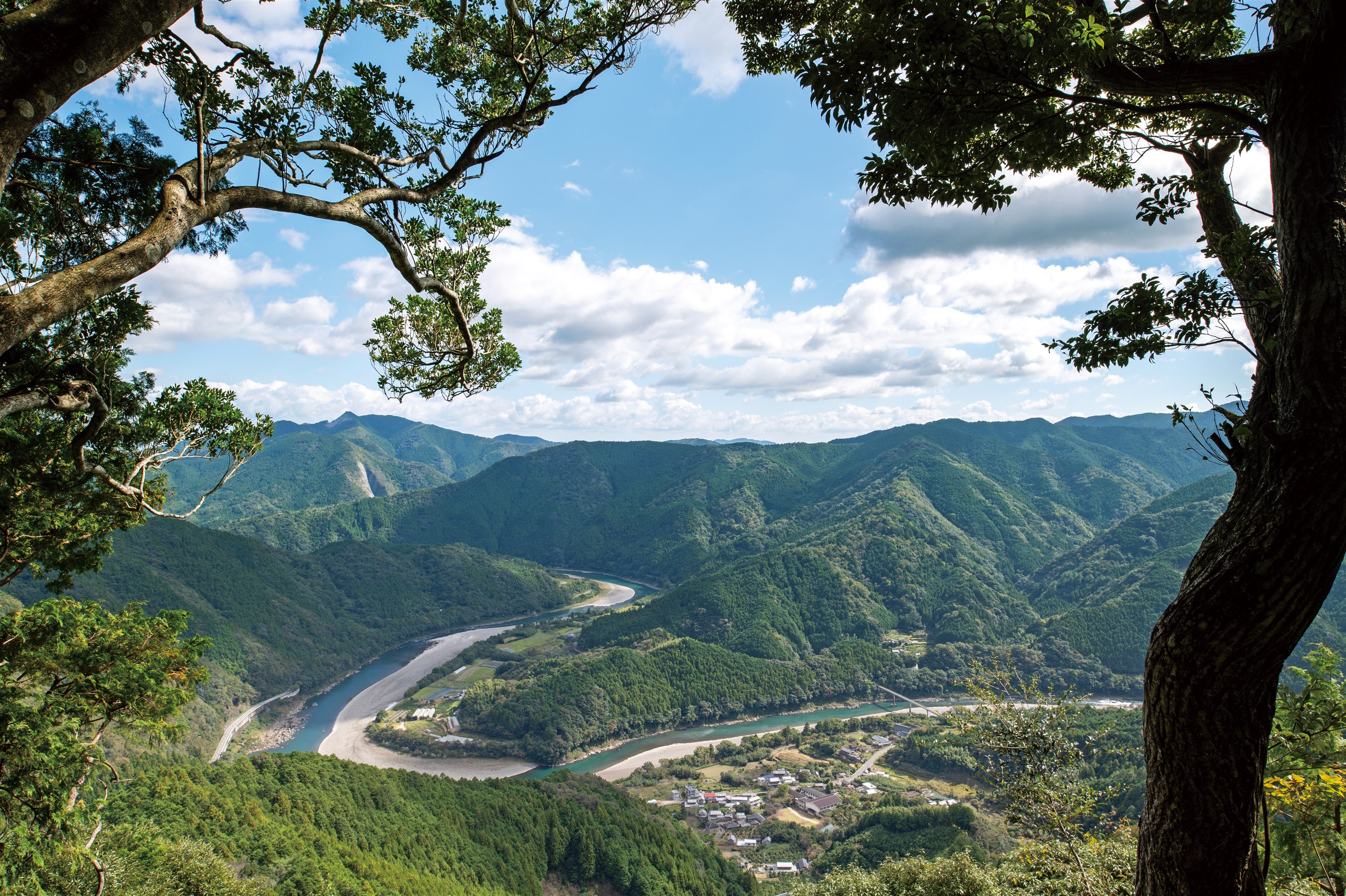 鶴林寺に向かう途中で、木立の切れ間から大きく曲がりくねった那賀川を一望できる。