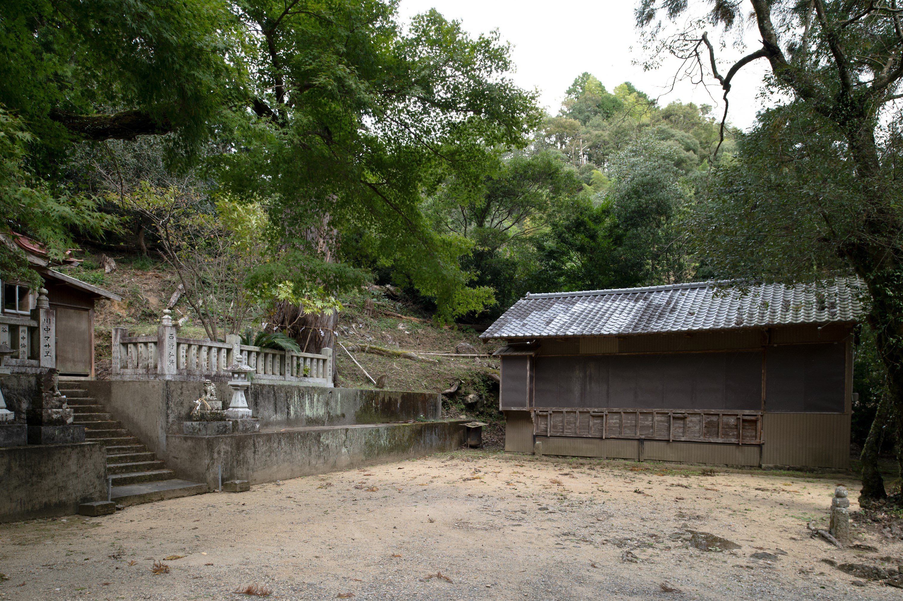 終点近くの『八幡神社』の境内には、かつて祭りのたびに芝居が演じられていた中筋農村舞台がたたずむ。