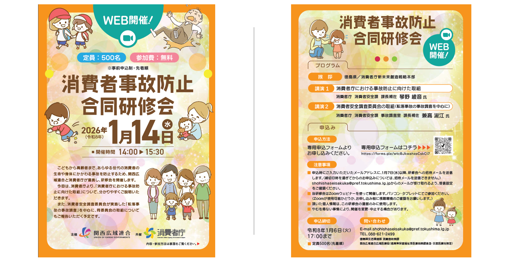 こどもから高齢者まで、すべての世代の消費者の生命や身体を守ることを目的に、関西広域連合と消費者庁が連携し、消費者事故の防止に関する研修会を開催いたします。