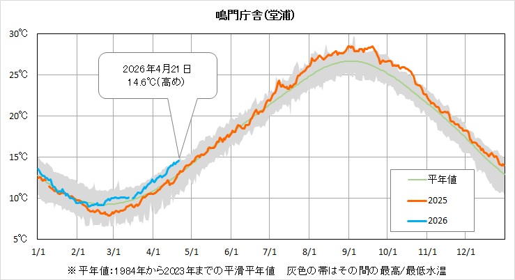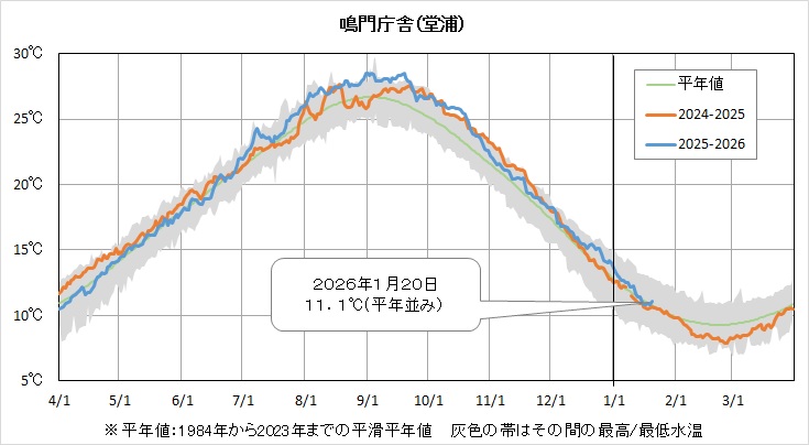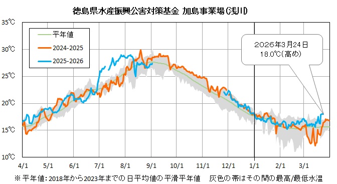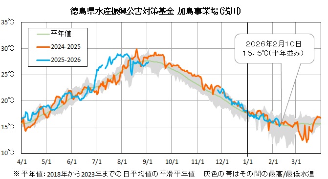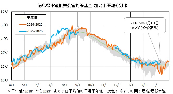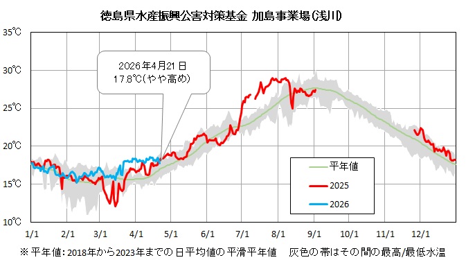 鳴門庁舎、徳島県水産振興公害対策基金 加島事業所の汲み上げ海水の水温はグラフのとおりです。